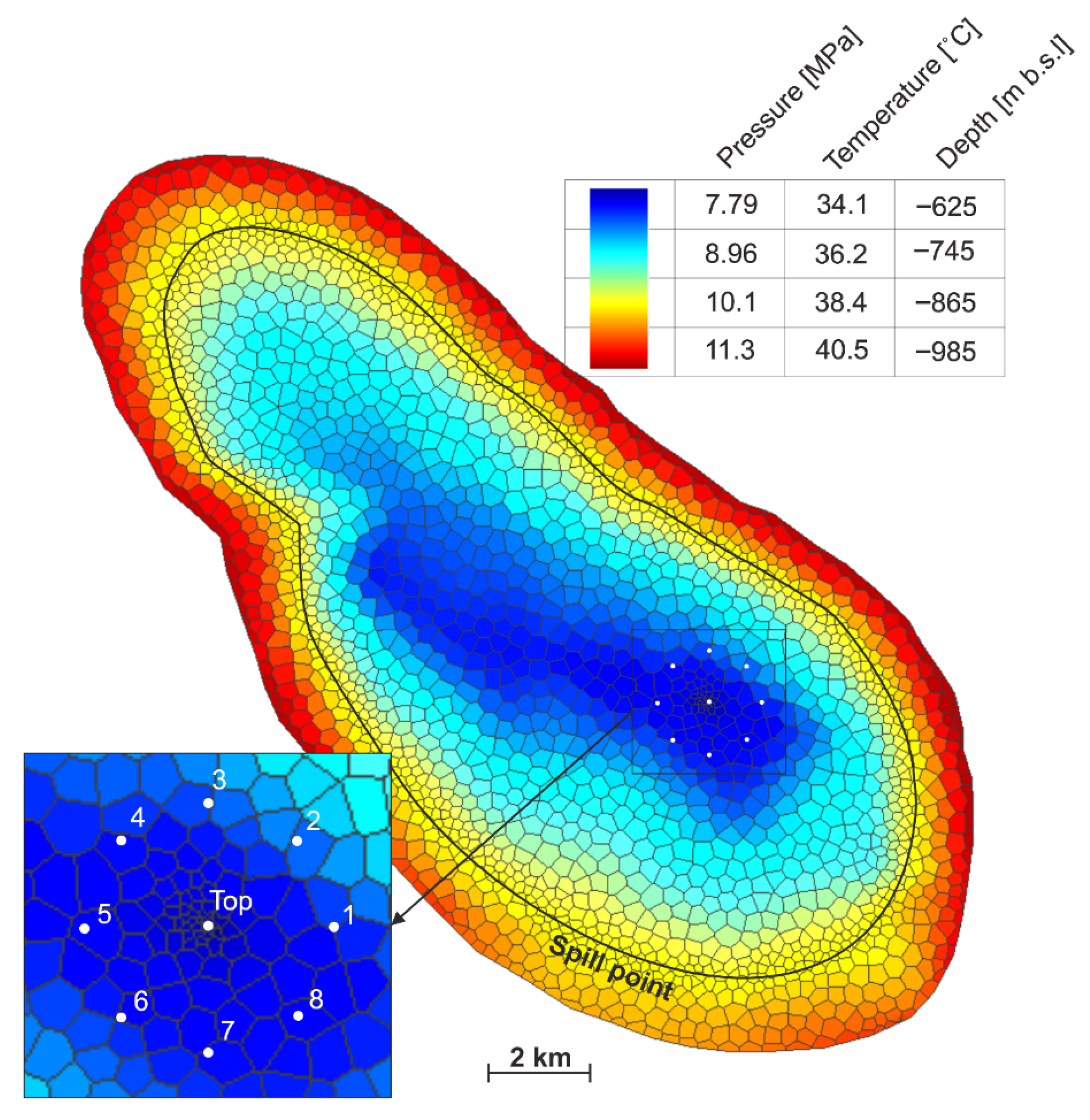 | Injection Well Location | Injection Rate [kg/s] | Hydrogen Storage Capacity [Tonnes] | Secant Dip Angle [°] | Tangent Dip Angle [°] | Reservoir Depth Range [m bsl] | Fracturing Pressure Range [MPa] | Capillary Pressure [MPa] |