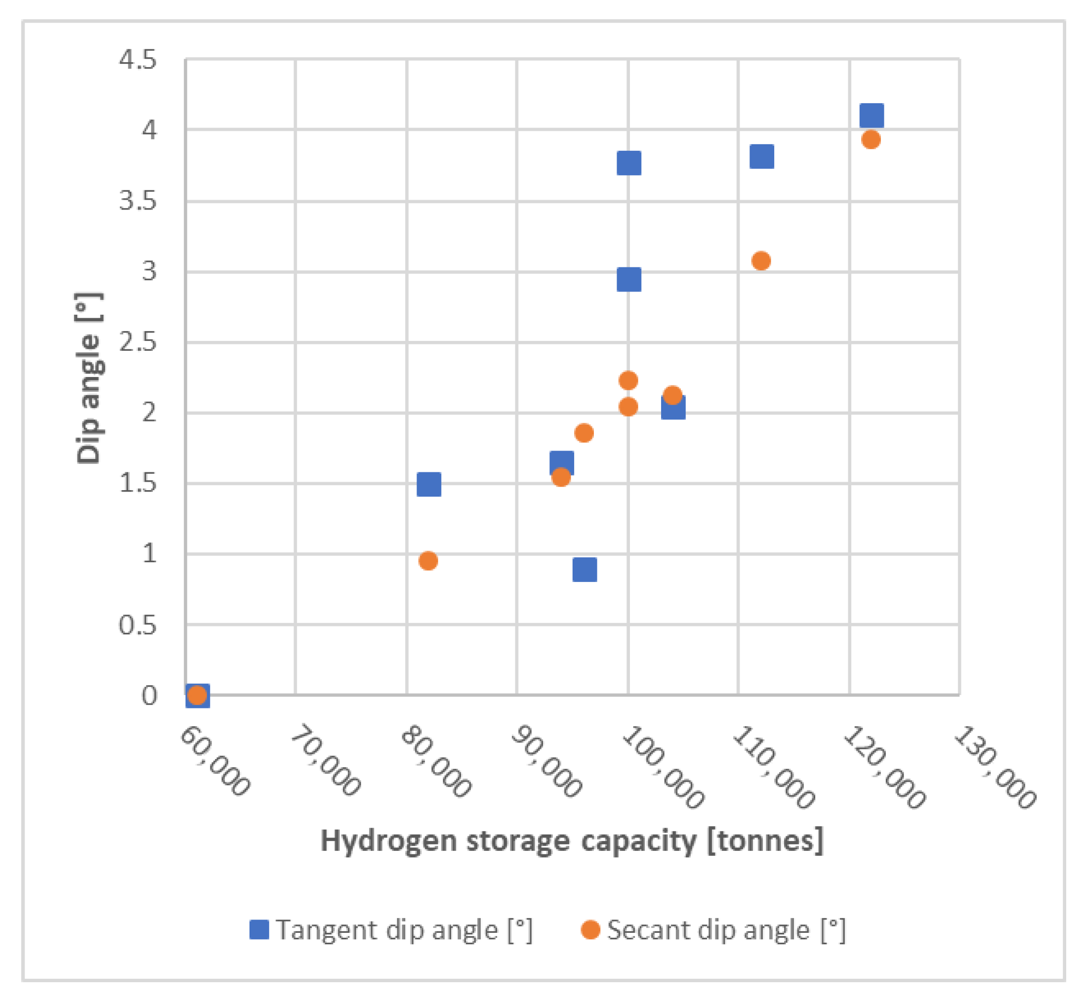 - The dynamic storage capacity for hydrogen injection is lower when the secant dip angle relative to the top of the dome structure and the tangent dip angle at the well location are smaller.