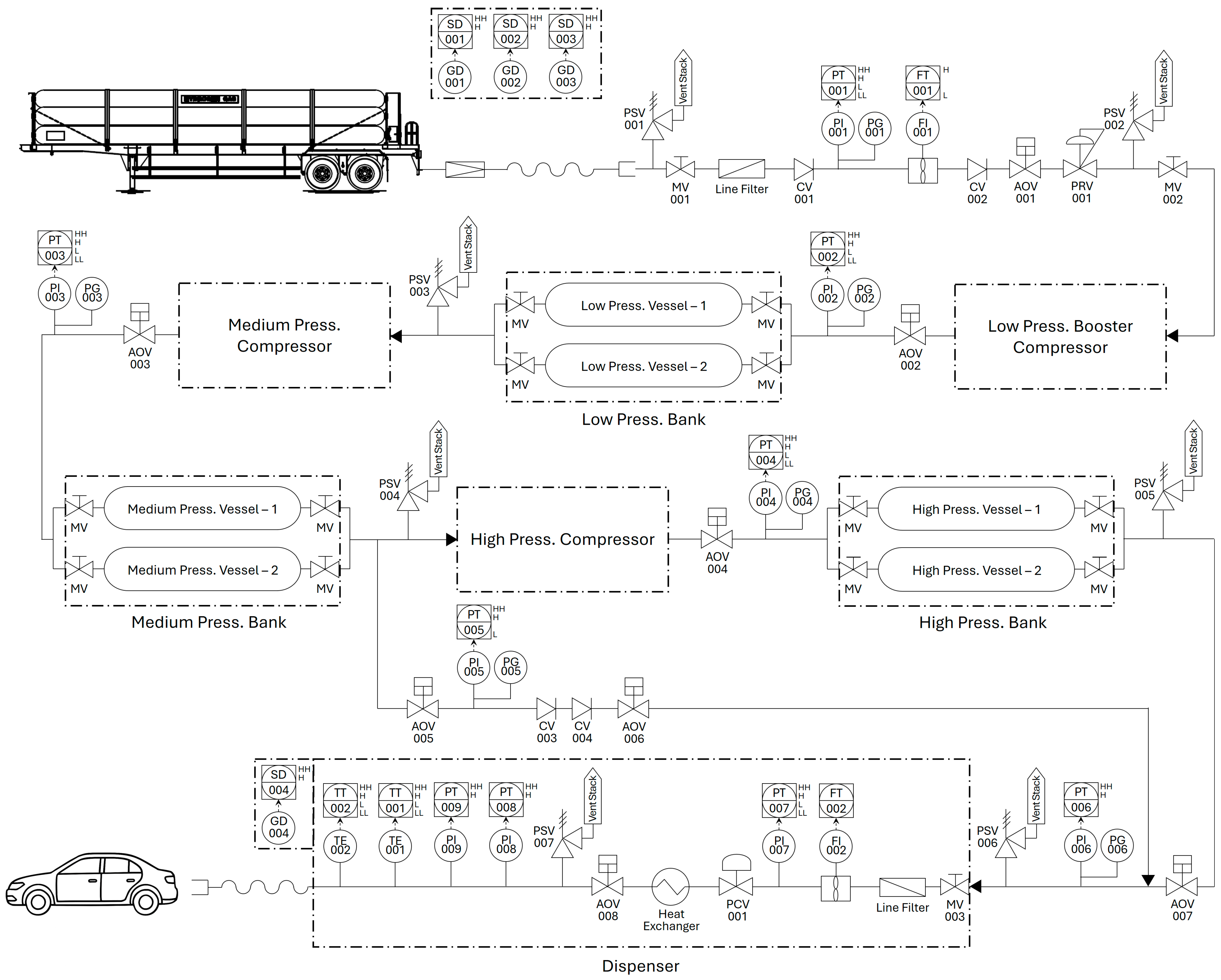 Hydrogen is supplied to the system via a high-pressure tube trailer, it passes through the filter and the flow pressure control unit and enters the system via the connecting hose. In the supply section, an air operated valve is installed to isolate the flow under abnormal conditions, while a check valve prevents backflow. A pressure safety valve is also installed to protect the system from overpressure. The Pressure Safety Valve (PSV) represents a typical mechanical safeguard, whereas the Air Operated Valve (AOV) and the logic-based control loop belong to the functional safety domain. The supply line pressure and flow are monitored and controlled by a pressure transmitter and flow transmitter, respectively, and multiple gas detectors are installed throughout the system to detect potential hydrogen leakage.