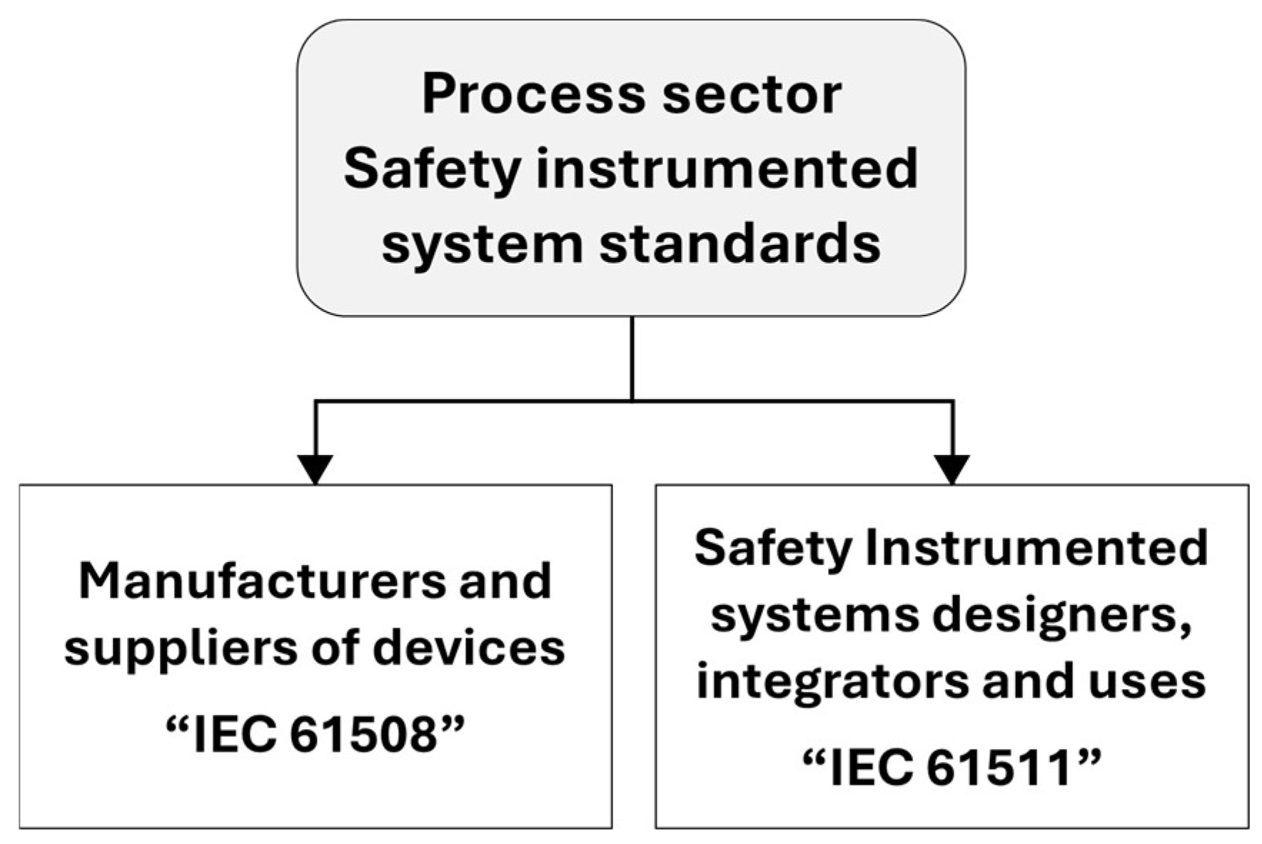 Figure 2, IEC 61508 applies primarily to manufacturers and equipment suppliers responsible for the design and development of safety related systems, whereas IEC 61511 is intended for designers, integrators, and end users of instrumentation and control systems in process industries. Accordingly, IEC 61511 was adopted as the applicable functional safety standard in this study.