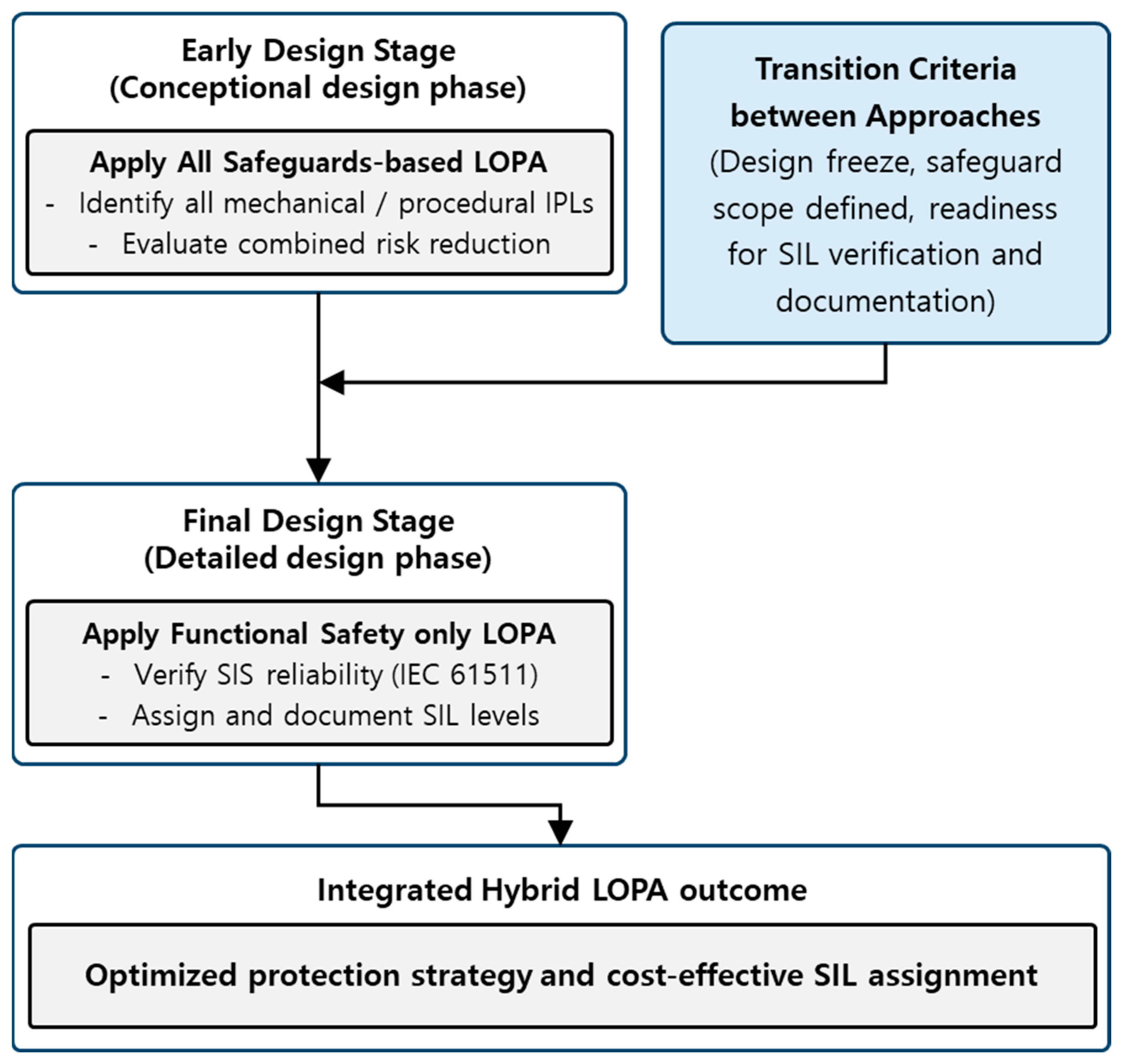 The results of this study indicate that each LOPA approach, Functional Safety Only and All Safeguards, offers distinct advantages depending on the design maturity and operational objectives. To establish a systematic integration between the two methods, a hybrid LOPA framework is proposed, as illustrated in