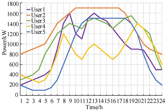 To validate the proposed energy storage configuration and evaluation model, a high-tech industrial park in China is selected as a case study in this work. The park is equipped with photovoltaic (PV) arrays and wind turbines and includes five representative user types with markedly different load profiles. The load curves of the five user categories on a typical day are shown in Figure 3; Figure 4 shows the PV output curve, whose peak occurs at approximately noon and coincides with the peak load periods of some users; Figure 5 depicts the wind turbine output curve, which exhibits intermittency and a certain peak shaving (anti-peak) characteristic. The photovoltaic and wind power data used in this study are based on the typical day operation data of the selected industrial park, which are used to reflect representative generation characteristics. It should be noted that the typical-day load and renewable generation profiles used in this case study aim to reflect representative operating characteristics; however, they cannot capture the full temporal variability and uncertainties present in real-world industrial park operation.
