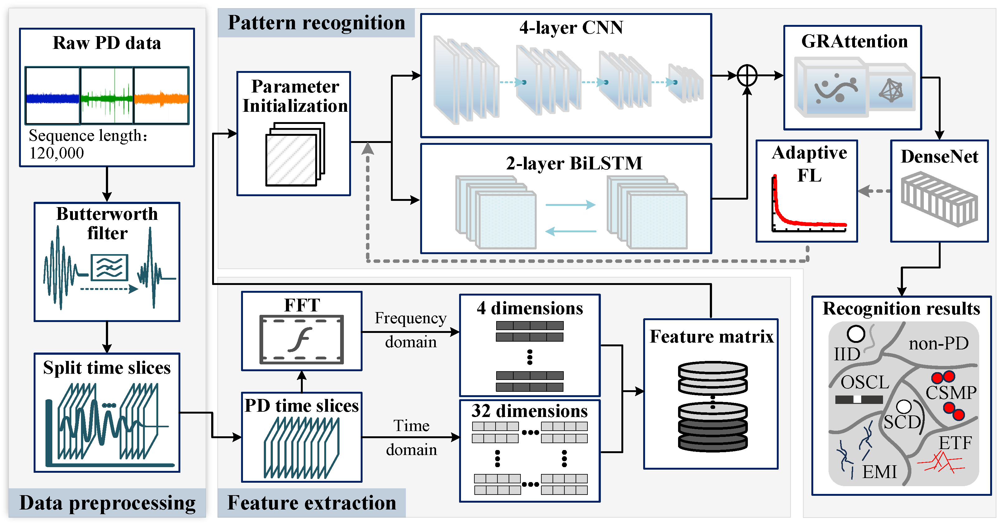 - An adaptive loss function tailored for PD scenarios is proposed to address the severe class imbalance between non-PD and PD fault samples. By introducing a peak factor as an adaptive modulation term, the loss function eliminates the need for manual parameter tuning while preserving the ability to focus on sparse and difficult samples, thereby improving training efficiency and classification robustness.