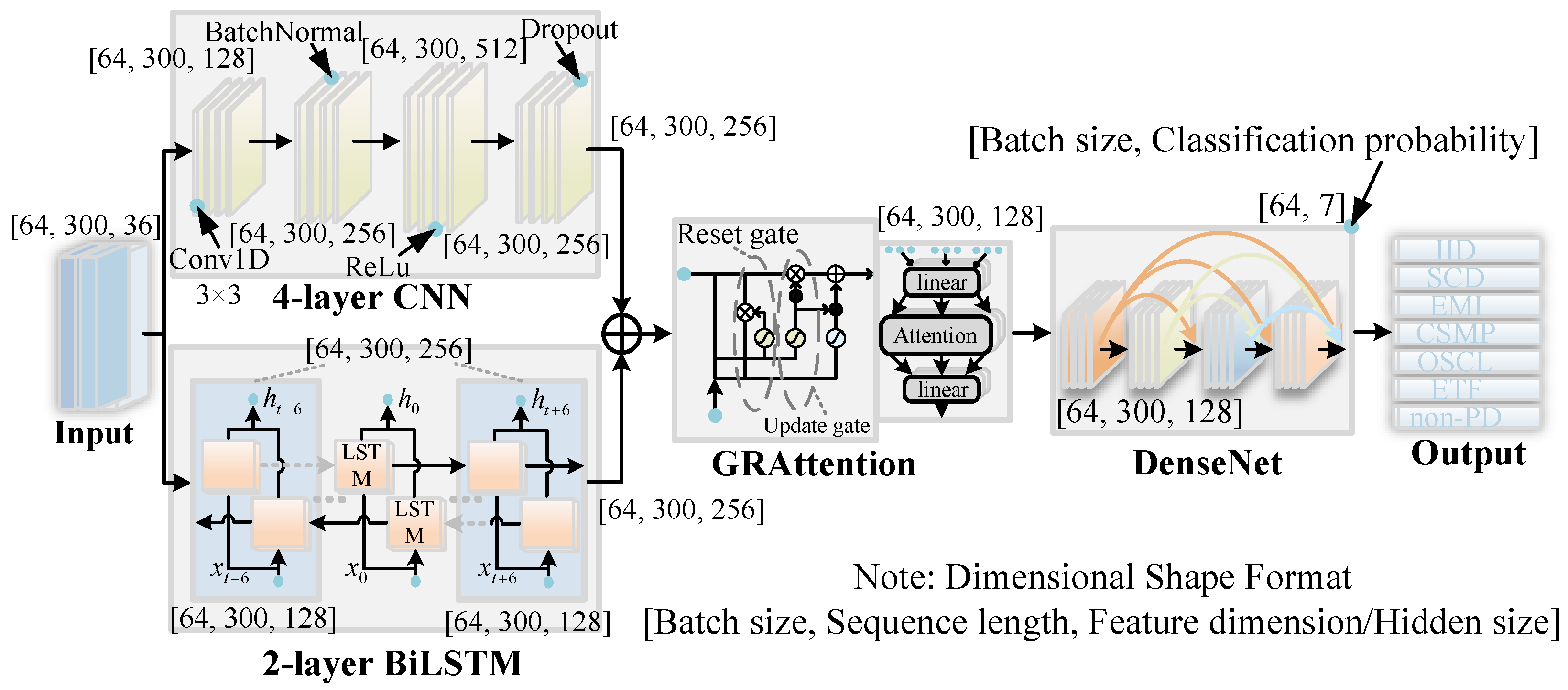 - For high-accuracy PDPR tasks, a refined PDPR network model based on DecPD is developed for PD samples under environmental noise. By incorporating parallel CNN-BiLSTM processing and the GRAttention module, the model effectively captures both long-term dependencies and short-transient PD features, enabling accurate discrimination among highly similar PD phenomena and significantly enhancing multi-type recognition performance.