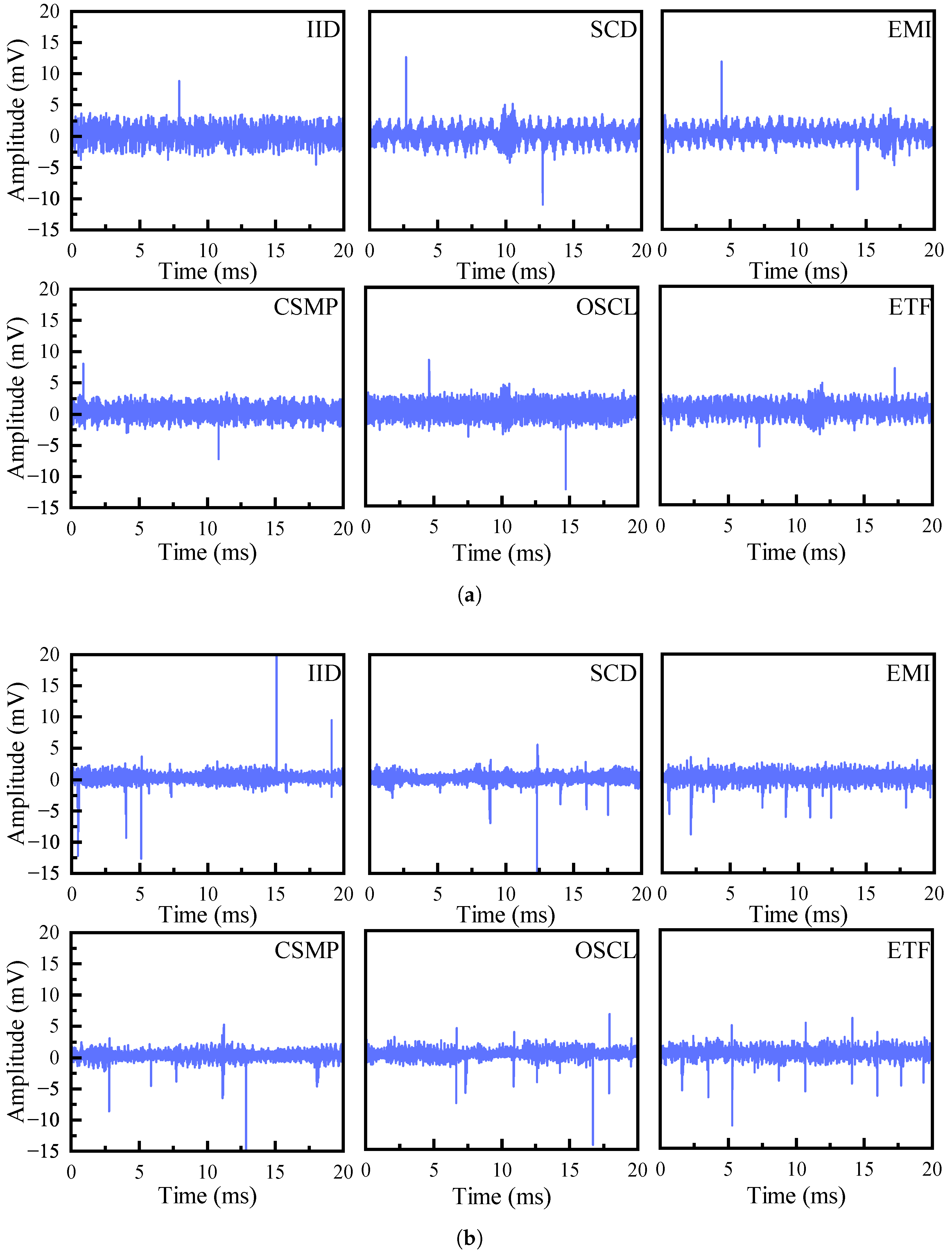 - Zhu, T.; Lin, Y.; Tian, H.; Yan, Y. A Cable Partial Discharge Localization Method Based on Complete Ensemble Empirical Mode Decomposition with Adaptive Noise–Multiscale Permutation Entropy–Improved Wavelet Thresholding Denoising and Cross-Correlation Coefficient Filtering. Energies 2025, 18, 5511. [Google Scholar] [CrossRef]