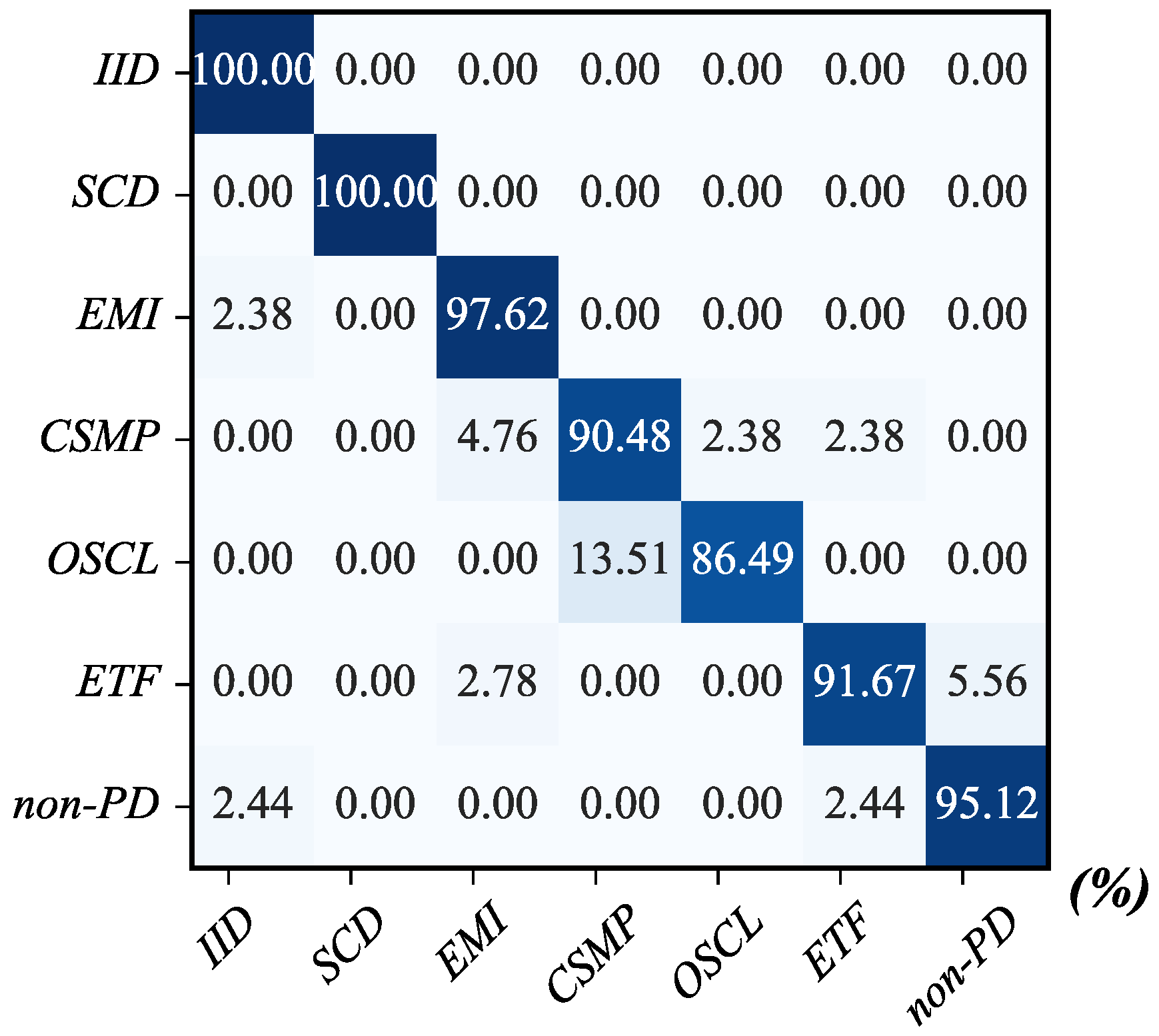 - A real-world dataset generated from a PD data generation and acquisition platform is constructed to validate the proposed approach. The dataset contains seven PD categories measured under practical noise conditions, enabling comprehensive evaluation and demonstrating the effectiveness of the proposed method in realistic on-site environments.