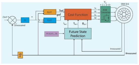 The operating principle of FCS-MPC is illustrated in Figure 3. The control loop begins by generating a speed error signal, defined as the difference between the measured speed and the reference setpoint. This error is processed by a PI controller to produce the reference current. Due to the strong nonlinear behavior of the SRM, where electrical variables depend heavily on rotor position, the following two Look-Up Tables (LUTs) are employed: