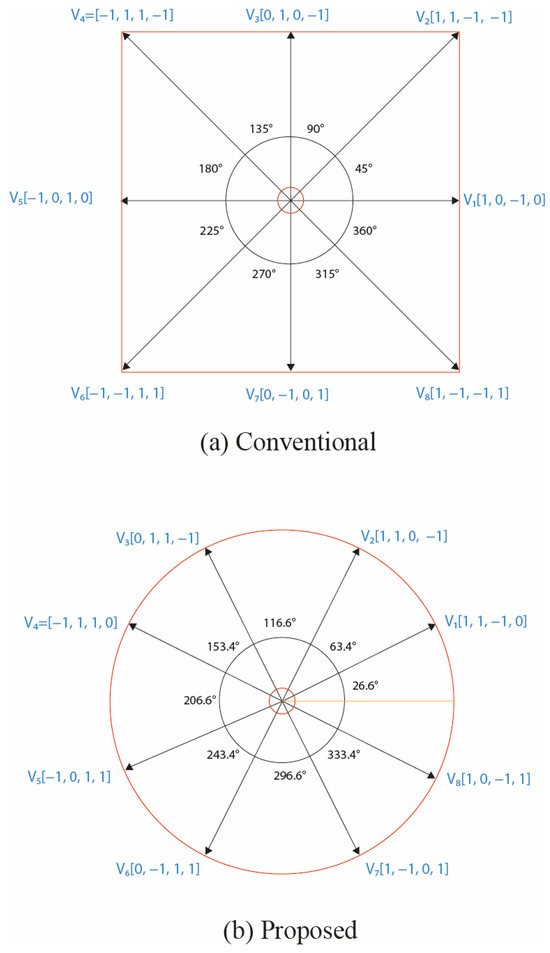 The mathematical foundation to explaining the benefits of the proposed vector set is outlined as follows. In the conventional FCS-MPC implementation for a 4-phase SRM, the standard eight-vector set includes single-phase excitation vectors ∣V∣ = 2 and dual-phase excitation vectors with ∣V∣ = 2.828.