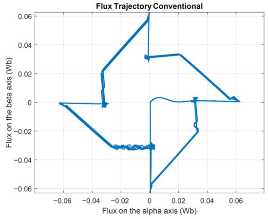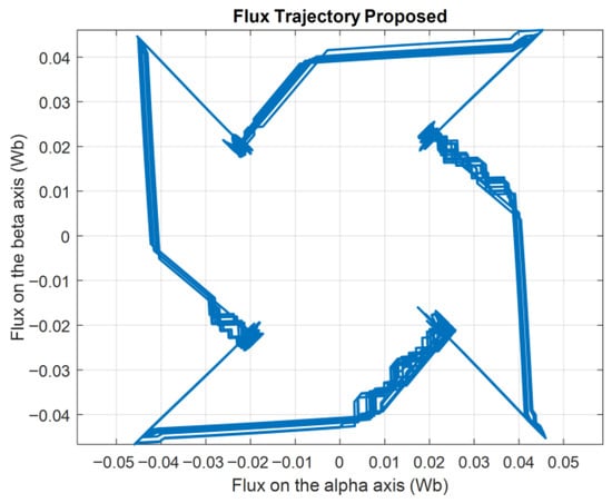 Figure 25 and Figure 26 present the α–β flux trajectories for the conventional and proposed control strategies, respectively. In the conventional method (Figure 25), the trajectory exhibits an irregular, asymmetric shape with nonuniform segment lengths, indicative of variable voltage vector magnitudes and inconsistent excitation between single- and dual-phase states. This irregularity can contribute to nonuniform current slopes and, consequently, higher torque ripple.