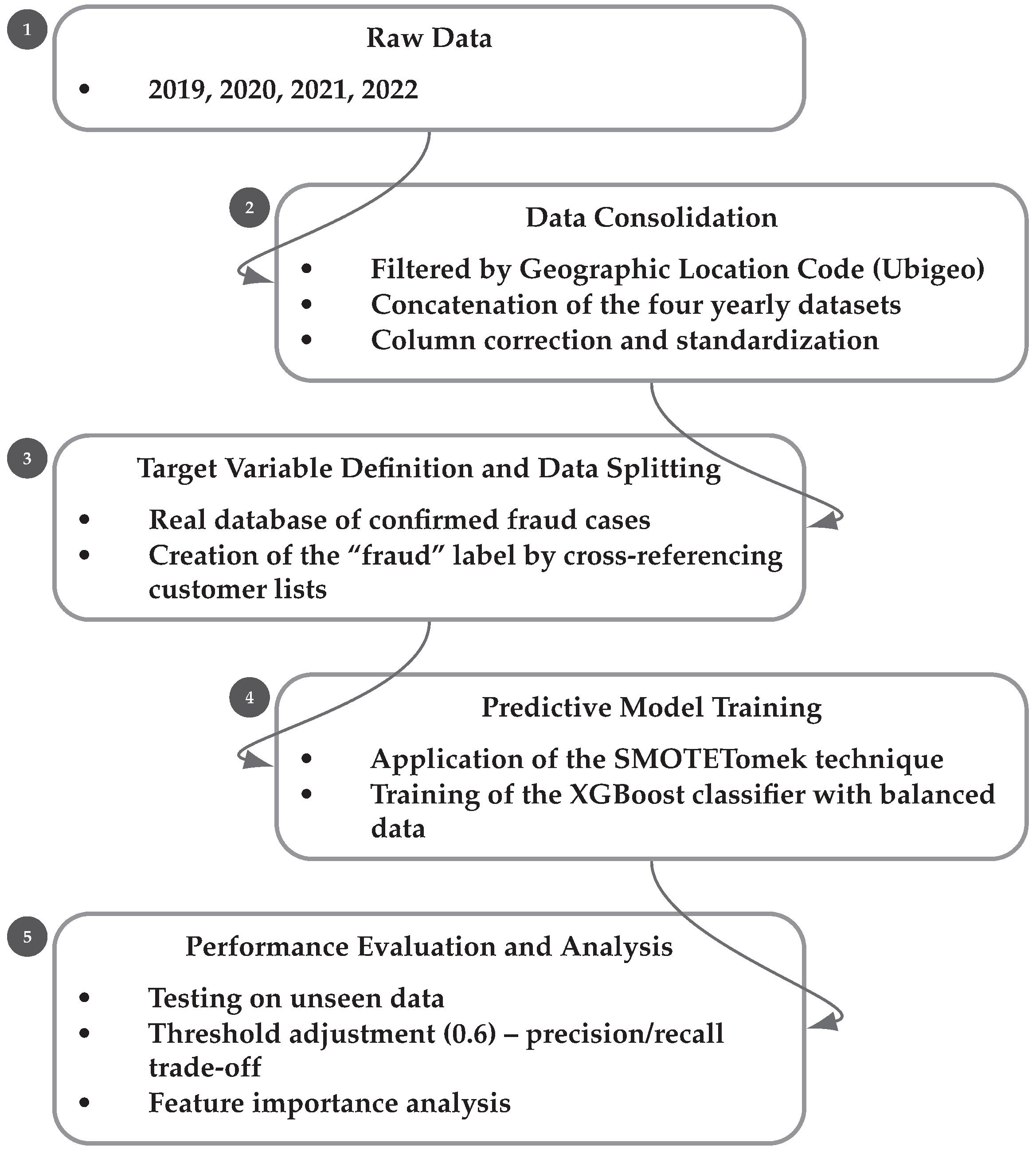 - Data Consolidation: This stage focuses on transforming multiple annual files into a single, structured, and labeled dataset suitable for supervised learning. It comprises three main tasks: (a) Filtered by Geographic Location Code (Ubigeo) to retain only the consumers relevant to the study region; (b) concatenating the four annual datasets (2019–2022) into a unified database, while adding a new column (YEAR) to preserve temporal reference; and (c) correcting and standardizing columns whose data types or names were inconsistent across years (e.g., a field stored as a string in 2019 and as a float in 2020). After consolidation, the filtered list of customers is cross-referenced with an external registry of confirmed fraud cases. This comprehensive preprocessing step ensures data integrity and provides a solid foundation for robust and generalizable model training.