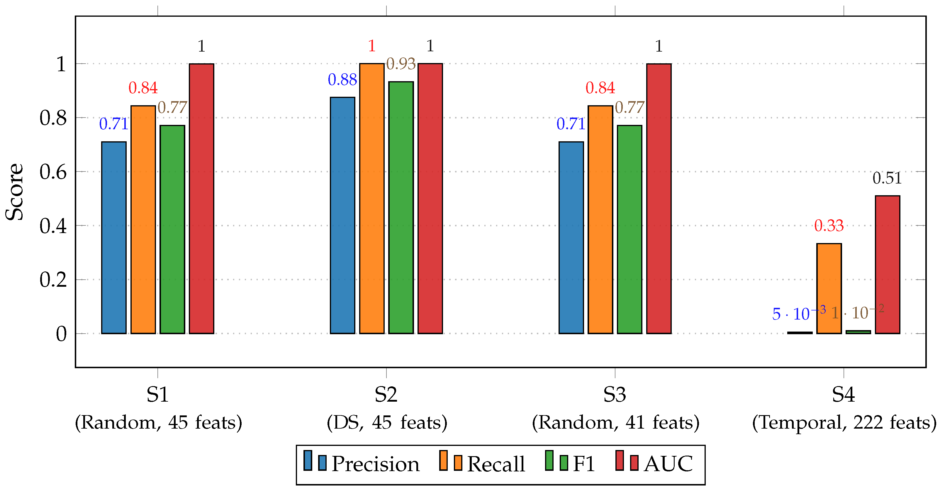 - Scenario 3 (Random Split with 41 Features): maintained performance nearly identical to Scenario 1 while employing a reduced feature set. The removal of secondary variables, such as auxiliary anomaly indicators, slightly simplified the model without compromising predictive quality. This result highlights the efficiency of carefully engineered features over excessive dimensionality, revealing that compact yet well-designed feature spaces can preserve discriminative strength while improving interpretability and reducing computational overhead.