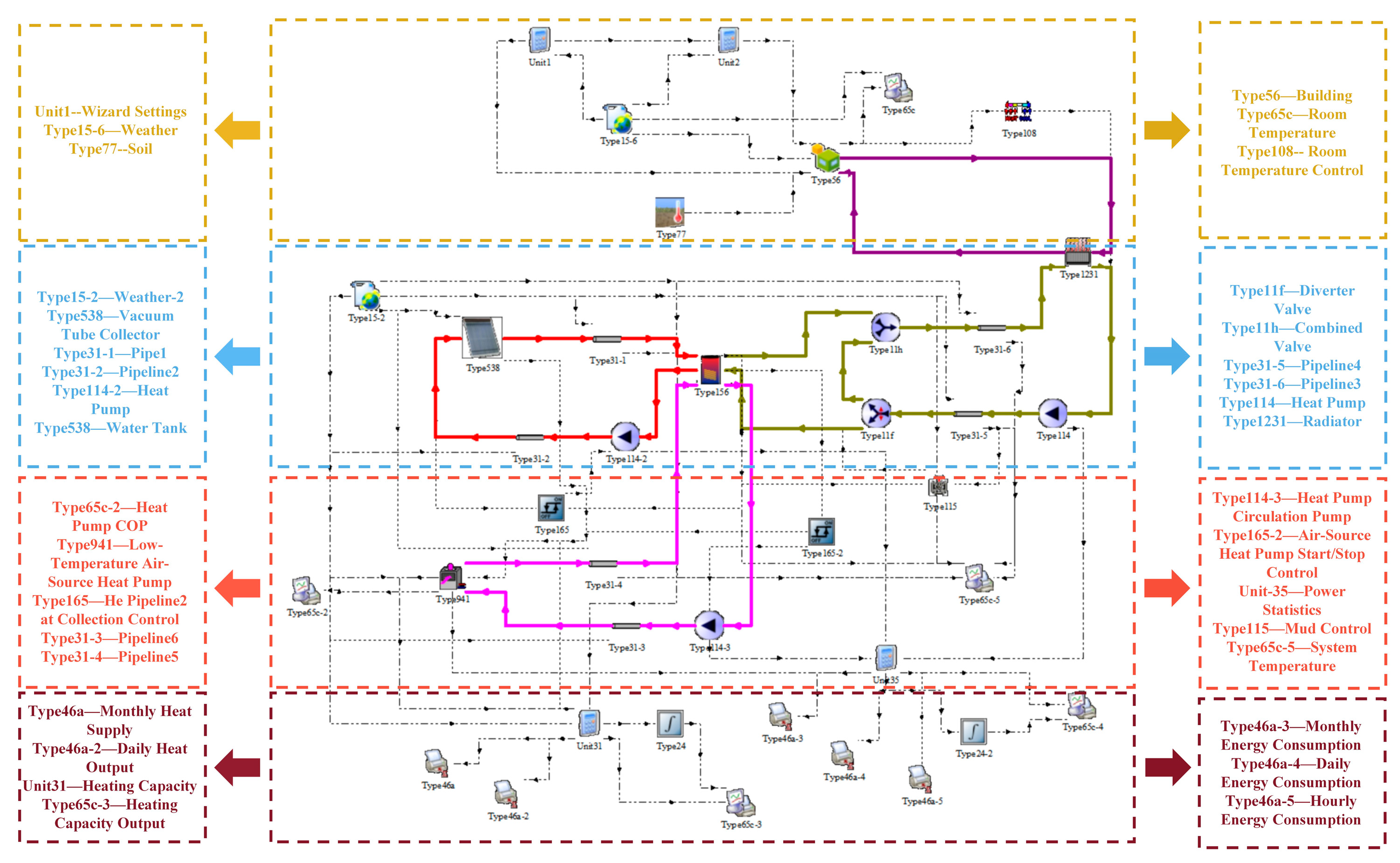 Vacuum Tube Collector Module (Type538): This module models the vacuum tube solar collector using Formulas (1)–(3) to simulate its heat collection process. The collector area is 7.4 m2, with a flow rate of 35 kg/h·m2 per unit area. The specific heat of the fluid medium is 3.53 kJ/kg·K. The collector efficiency parameters are 0a = 0.73 and 1a = 13.5.