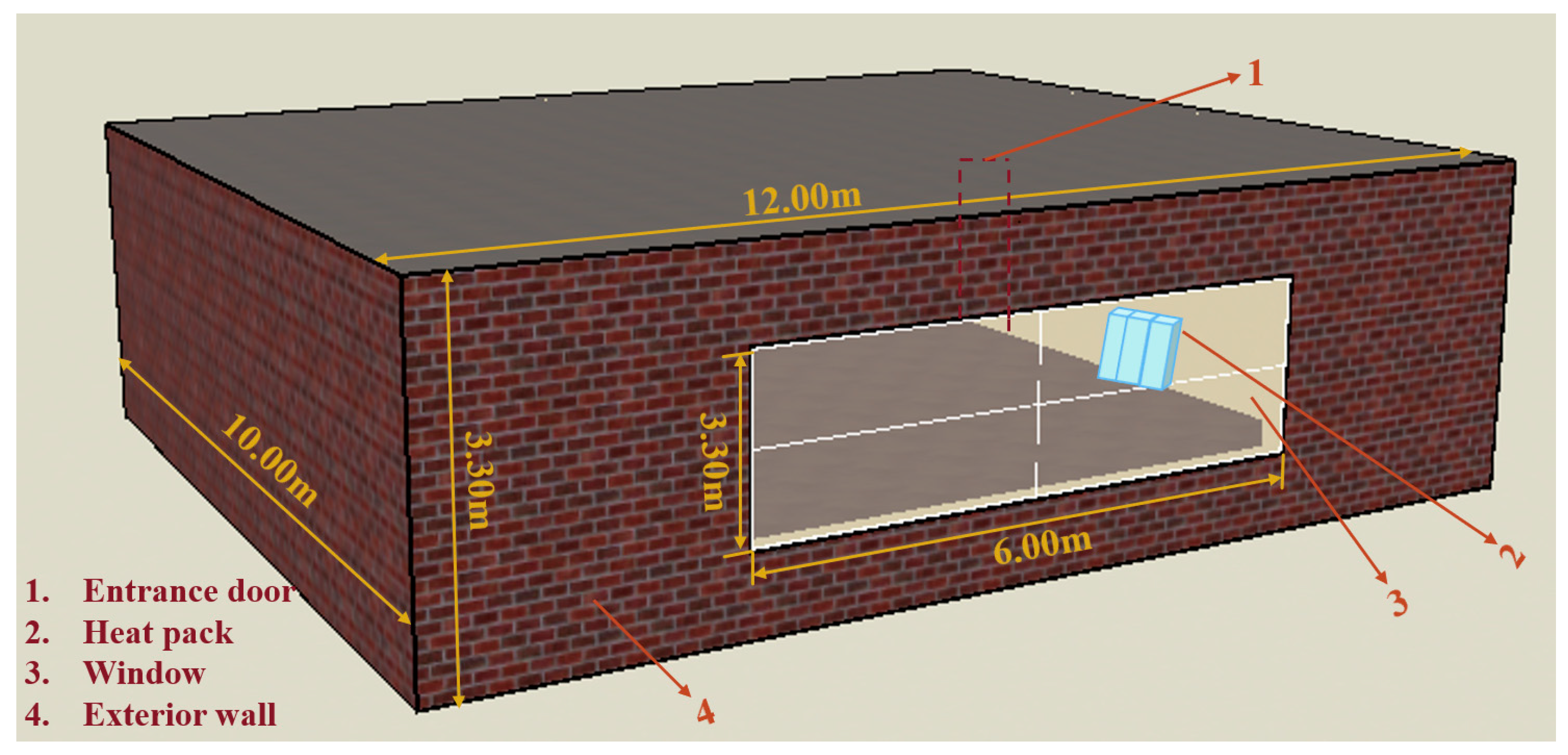 Figure 2, the simulated building model has dimensions of 12 m (length), 10 m (width), and 3.3 m (height), with a volume of 396 m
