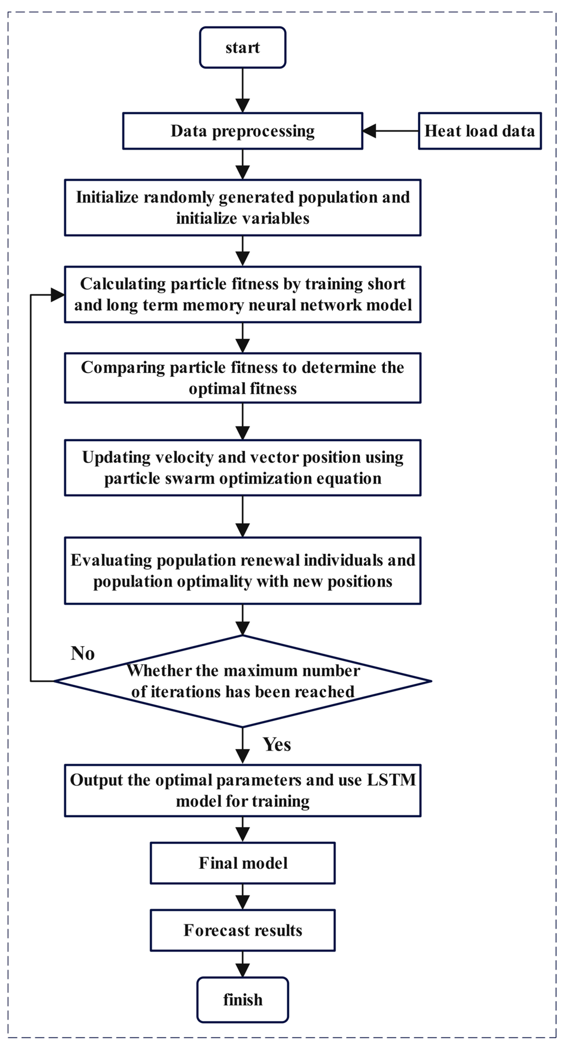 16]) also built a series of CNN-LSTM models, proving that the method has higher prediction accuracy compared to a single neural network. However, the method has the problems of a single structure, slow convergence of the algorithm, fixed input characteristics, etc., which make it difficult to realize the rapid adjustment of the input characteristic parameters and meet the needs of engineering applications. To enhance the accuracy and reliability of short-term load forecasting for solar heating systems in southern Xinjiang, this study proposes integrating the particle swarm optimization (PSO) algorithm into long short-term memory (LSTM) neural networks to achieve automatic optimization of hyperparameters (Chen et al., 2025 [
