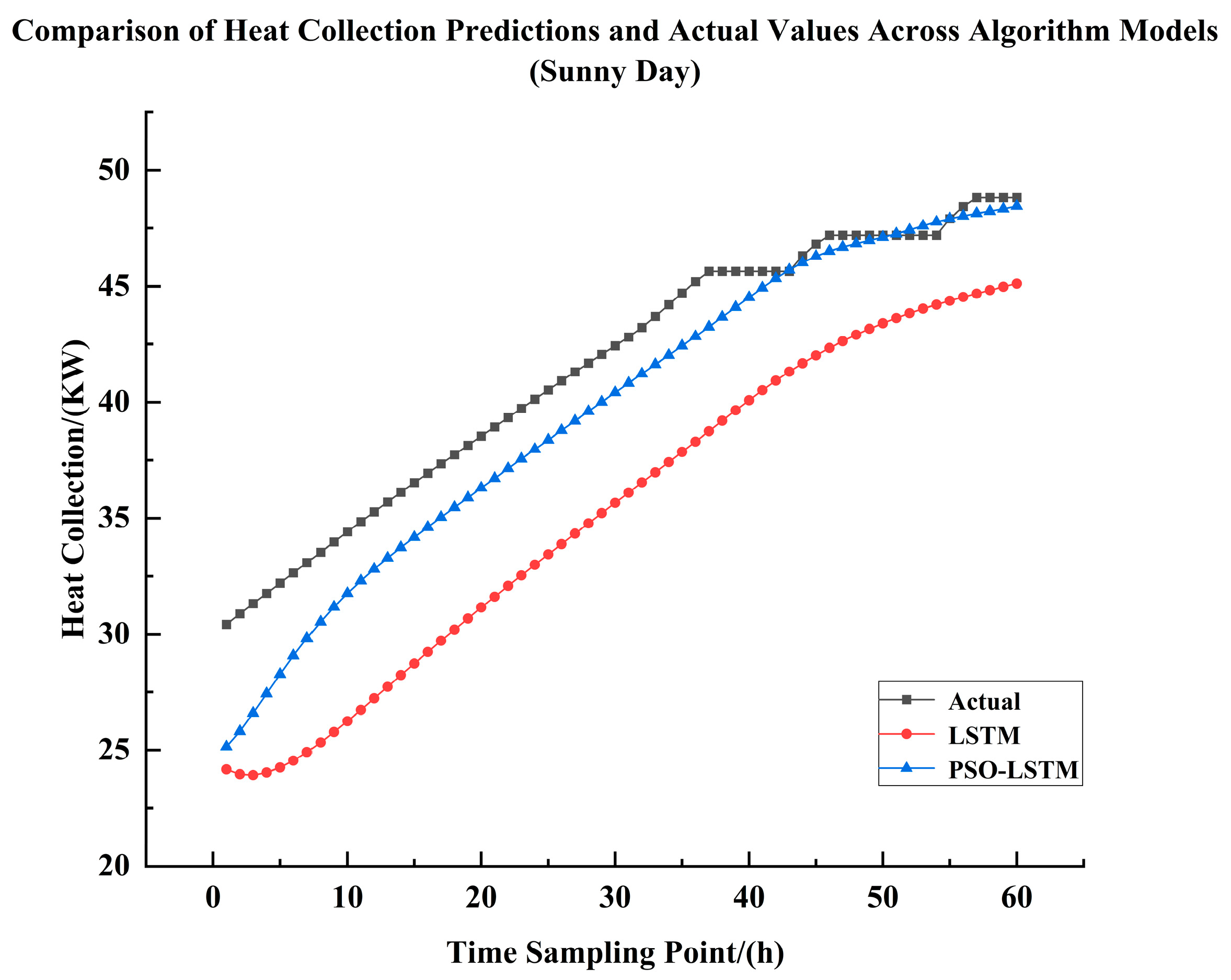 p < 0.05) in the prediction of heat collection between the two models. The LSTM model optimized by PSO demonstrated a significant improvement in its performance for predicting heat collection.