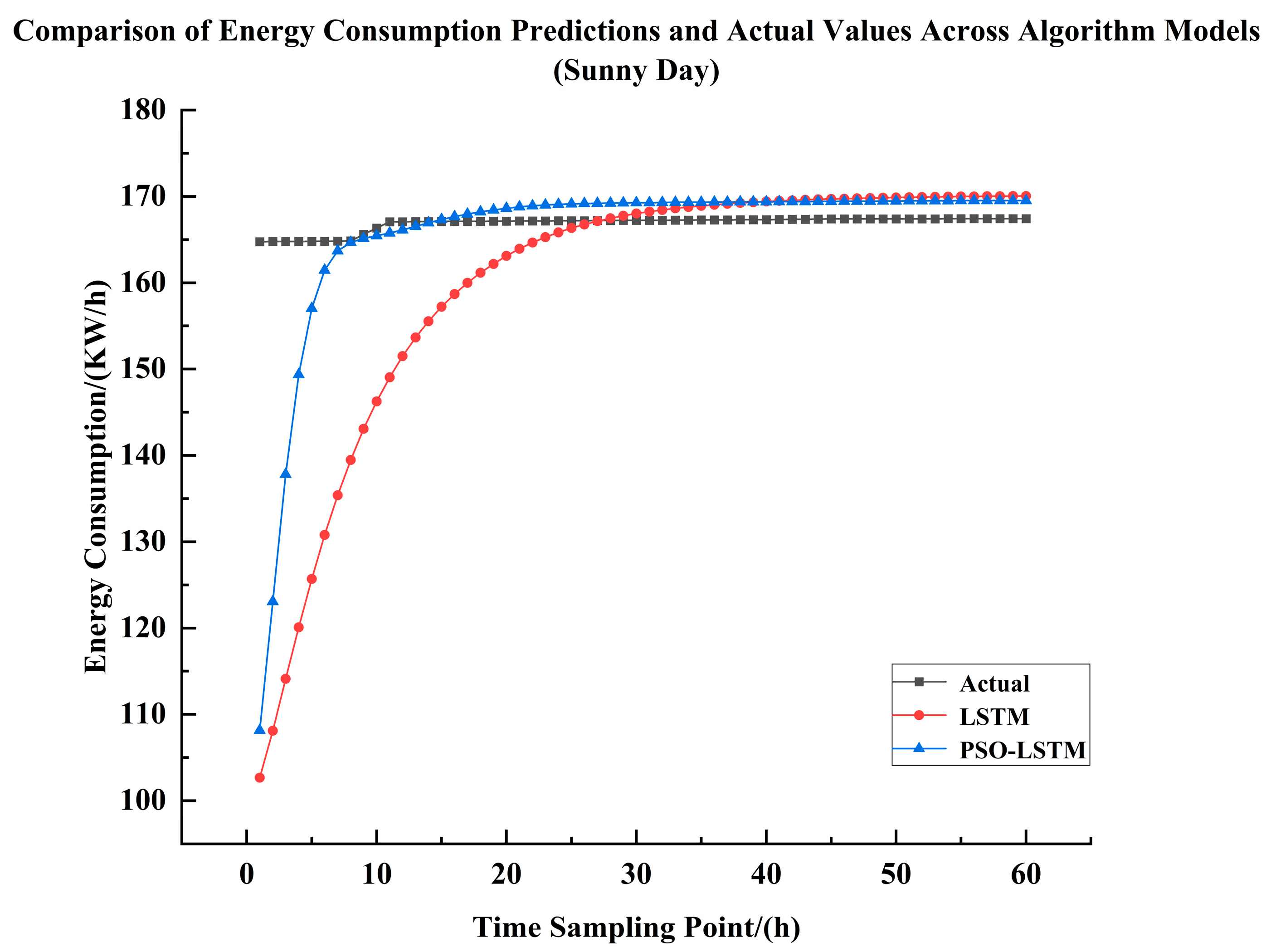 System Energy Consumption Simulation Experiment for Sunny Days, it is obvious that the PSO-LSTM neural network has a higher degree of curve fitting than the LSTM neural network through