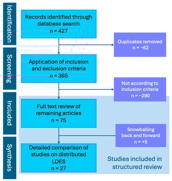 An initial screening based on titles and abstracts was then conducted, guided by the inclusion and exclusion criteria outlined earlier. This step narrowed the pool to 75 potentially relevant studies. A subsequent full-text review and snowballing techniques—both backward (reference lists) and forward (citations)—were employed to identify additional relevant literature that may not have appeared in the initial search results. A final total of 27 studies with a special focus on distributed long-duration energy storage and a grid-supportive behavior have been then compared in detail, as outlined in Table 1. The detailed findings are then discussed in Section 3. The full process of the review is detailed in Figure 2.