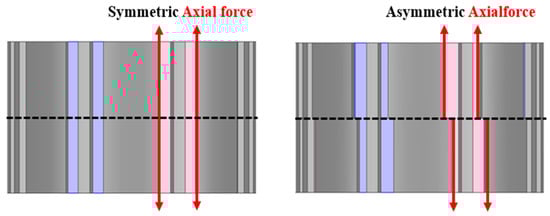 In particular, the skew technique introduces structural asymmetry along the rotor’s axial direction, which consequently leads to an increase in axial force [,,]. As shown in Figure 1, in a symmetric rotor structure, the axial magnetic forces generated on both sides are balanced and cancel each other out, resulting in negligible axial force. In contrast, in a skewed (asymmetric) rotor structure, the symmetry of the axial forces is broken, and a net force acts toward one side of the shaft. This imbalance produces an overall axial force that can increase mechanical vibration, noise, and bearing load, particularly in high-speed operation.