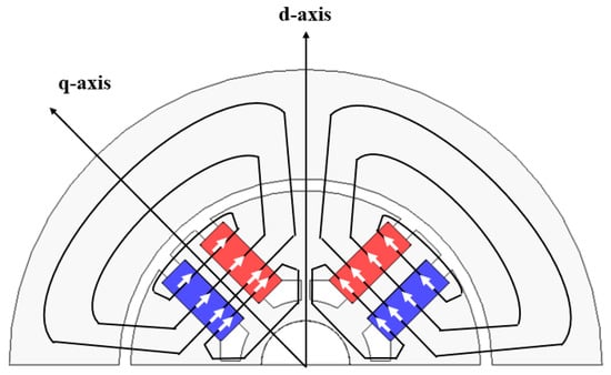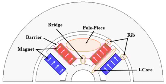 Figure 3 illustrates the configuration of a two-segment permanent magnet flux-concentrated spoke-type motor. The rotor consists of permanent magnets, which serve as the flux source, pole-pieces and I-cores placed between the magnets, bridges that mechanically support the pole-pieces, ribs that prevent magnet scattering, and barriers that suppress flux leakage to adjacent poles. The arrows indicate the magnetization direction. As shown in Figure 3, the spoke-type structure arranges the permanent magnets in the radial direction to concentrate the flux, thereby achieving high magnetic torque.