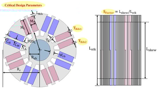 Furthermore, the skew factor is an additional design variable introduced to control both cogging torque and axial force. The skew factor is defined as the ratio of the skew length to the total stack length , as expressed in Equation (12), and its value lies between 0 and 1. A higher (approaching 1) indicates a greater degree of skew, which amplifies the effect of the asymmetric ribs, whereas a lower (approaching 0) corresponds to a symmetric configuration without skew. Accordingly, the selection of serves as a key factor in determining the target levels of cogging torque and axial force. When minimizing cogging torque is prioritized, a larger is preferred; conversely, when axial force reduction is emphasized, a smaller is more suitable.