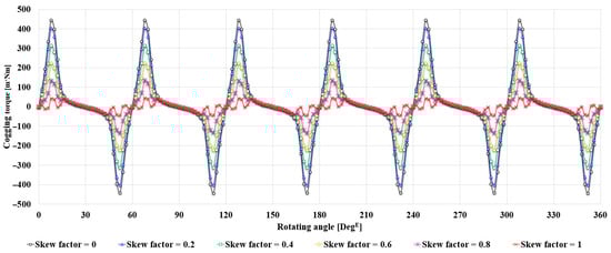 A skew factor of 1 indicates that 100% of the total stack length of the motor corresponds to the skewed region, whereas a skew factor of 0 represents a fully symmetrical structure without any skew. In other words, the skew factor is defined as the relative ratio of the skewed region to the total stack length. According to the results shown in Figure 11, the cogging torque varies with the skew factor, and it tends to decrease as the skew factor is reduced. This is because the skewed region with asymmetric ribs, which contributes to cogging torque reduction, becomes smaller. Therefore, in order to maximize the cogging torque reduction effect, it is desirable to set the skew factor as high as possible.
