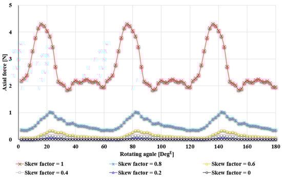 Figure 10 presents the process of reducing the axial force by applying the skew factor. When the axial force exceeds the allowable limit, the skew factor is adjusted to alleviate the asymmetry of the axial magnetic flux, thereby reducing the axial force. The skew factor is varied, and the analysis is repeated until the axial force reaches the target level.