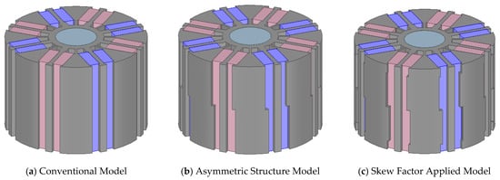 The design process of the skew-factor-applied electric machine, which simultaneously considers cogging torque and axial force, is illustrated step by step in Figure 8, Figure 9 and Figure 10.