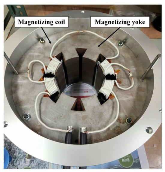 Figure 15 illustrates the internal structure and final configuration of the fabricated magnetizing yoke. The yoke consists of eight teeth and a back yoke, among which four teeth are wound with coils to generate the magnetizing field. The remaining four teeth serve to prevent demagnetization of the already magnetized permanent magnets.