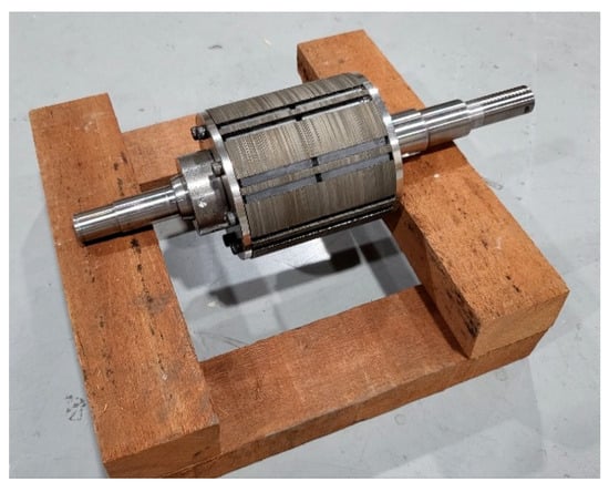 The winding employed AIW enamel copper wire with a diameter of 2.6 mm, and double-coated insulation wire was used to enhance dielectric performance. The detailed specifications of the magnetizing yoke and the winding are summarized in Table 2. The core of the magnetizing yoke was fabricated using 50PN470 (S18) material to minimize eddy-current effects. In addition, to prevent incomplete magnetization of the rotor’s upper permanent magnets caused by axial leakage flux, the lamination length of the magnetizing yoke was made 5 mm longer on each side than the lamination length of the motor.