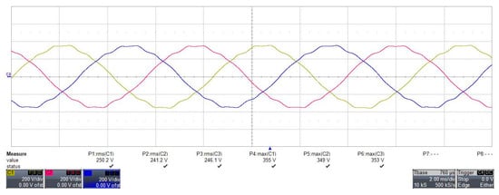 The no-load back electromotive force (EMF) was measured by driving the motor at 1800 rpm, with the terminals open, using a dynamometer. The waveform of the measured line-to-line back EMF is shown in Figure 19, and the root-mean-square (RMS) values from both analysis and experiment are summarized in Table 4. The analytical result was 246.1 , while the experimental result was 245.9 , showing an error of only about 0.1%, which indicates an excellent agreement between the two results.
