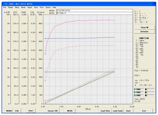 To evaluate the performance of the prototype, a load test was conducted. In this test, torque, output power, efficiency, speed, and current were measured, and the results are presented in Figure 20. The horizontal axis of the figure represents torque, while the vertical axis corresponds to efficiency, voltage, output power, current, and speed. At the rated speed of 1800 rpm, a torque of 8 Nm and an output power of 1.5 kW were obtained, with an efficiency of 92.84% under the rated load condition.