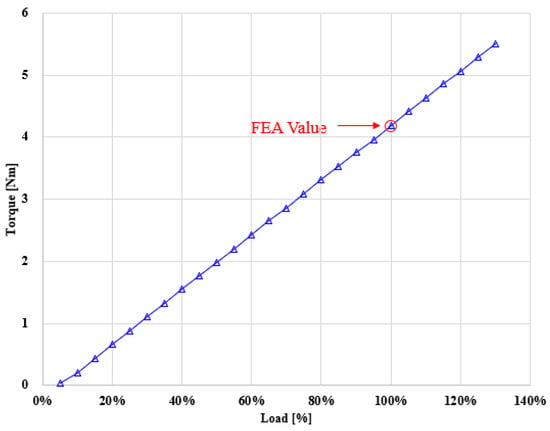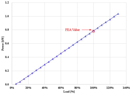To verify the performance of the prototype, the simulation results for torque, efficiency, and output power were compared with the experimental results. Figure 21 presents the torque characteristics, Figure 22 shows the efficiency characteristics, and Figure 23 illustrates the output power characteristics, each comparing the simulation and experimental outcomes. The numerical comparison is summarized in Table 5.