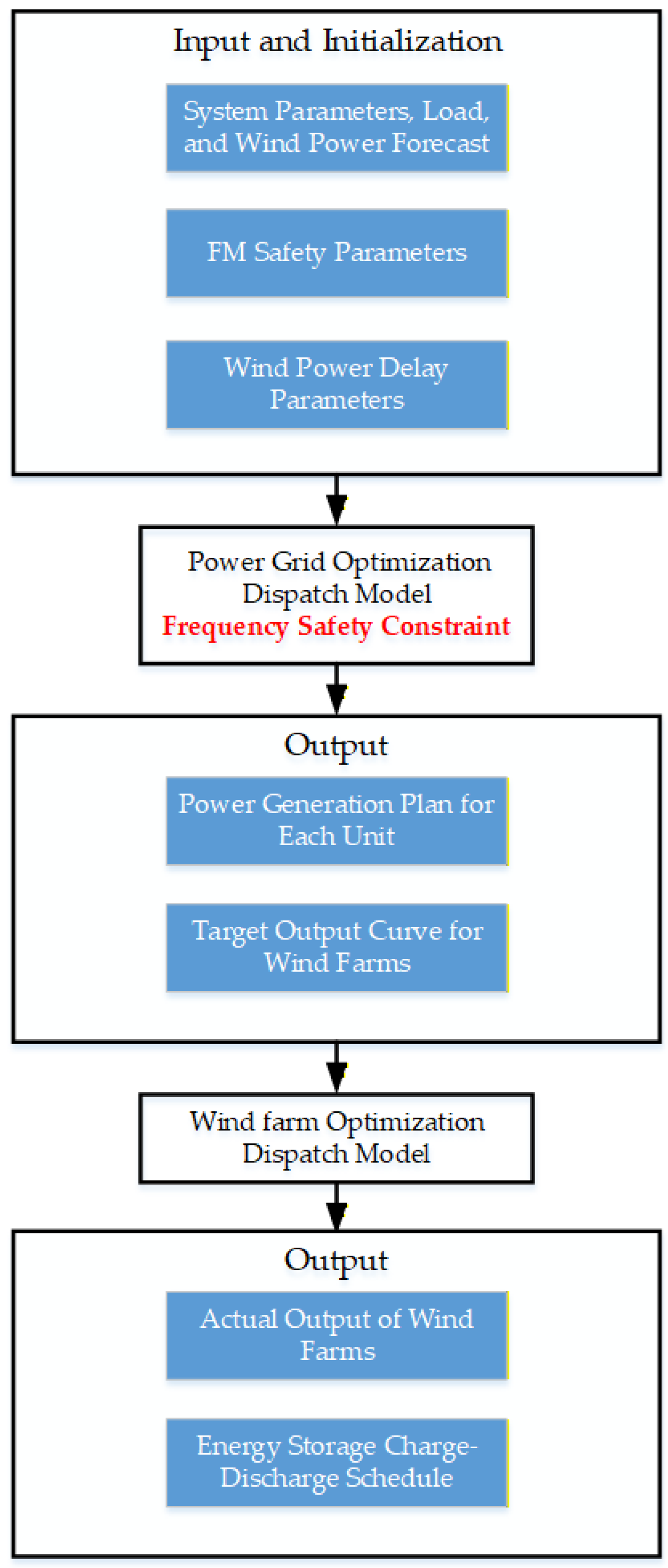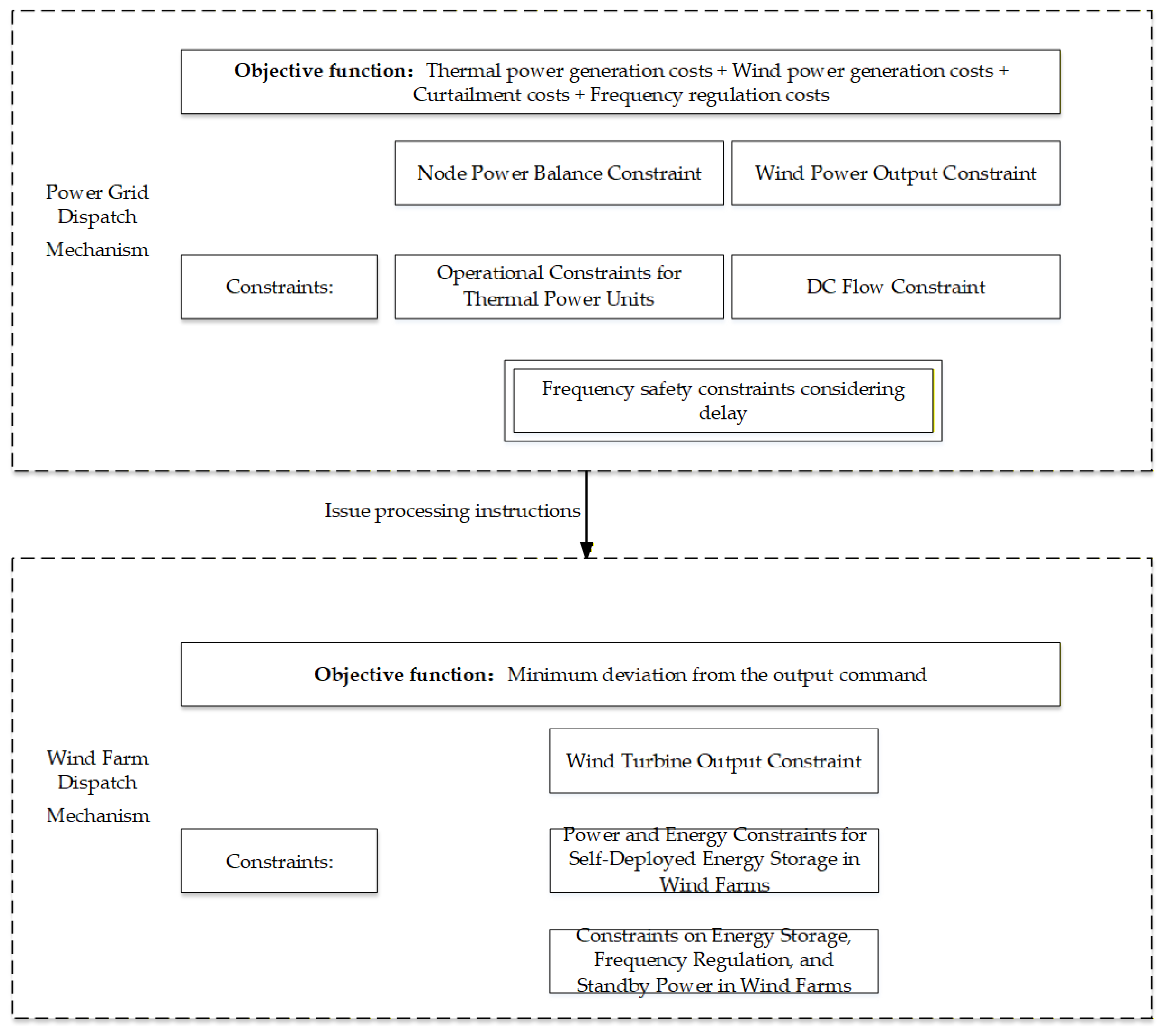 Building upon this foundation, the power grid dispatch model explicitly incorporates the impact of wind turbine frequency regulation time delay on system frequency dynamics by introducing a time-delay response model. This enhances the system’s resilience against low-inertia disturbances. Model outputs include power output plans for each unit and frequency regulation reserve capacity at every time step, with wind power frequency regulation request information transmitted to the wind farm dispatch to support next-level optimization.