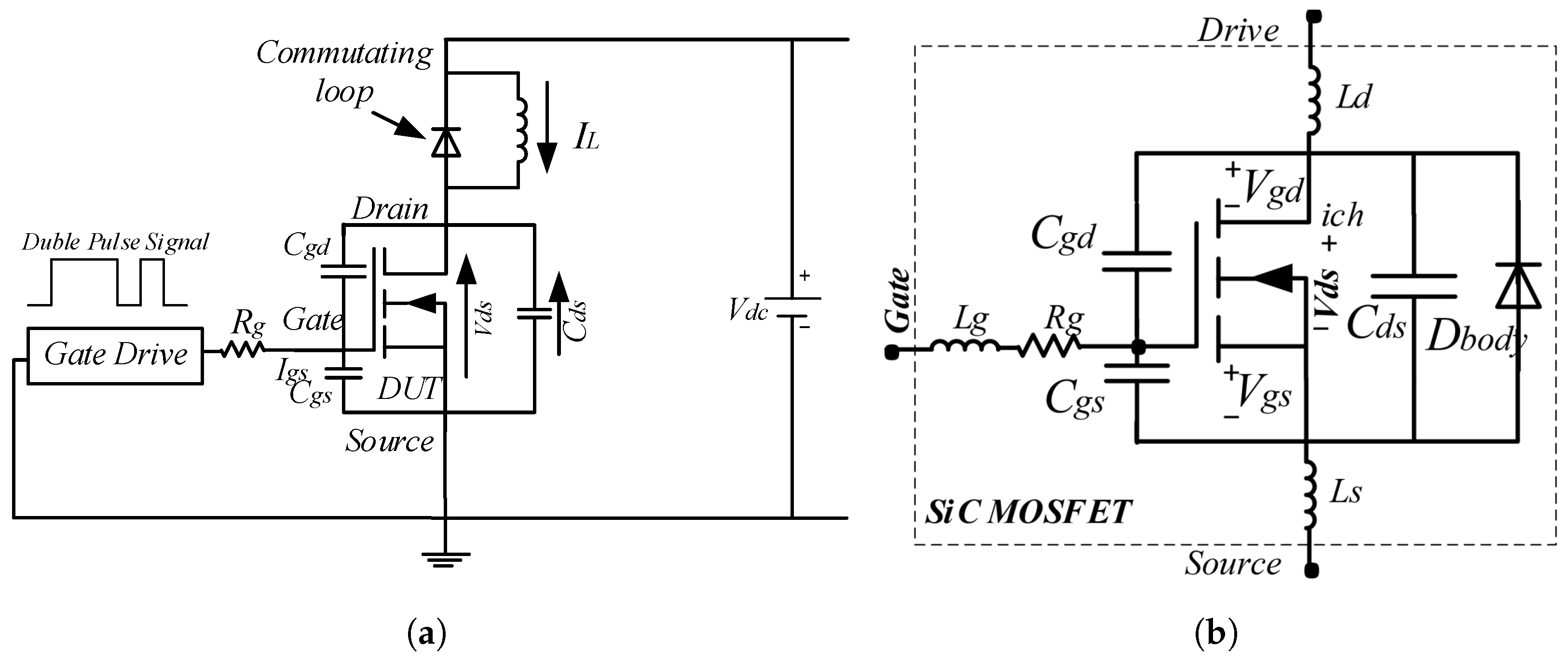 Figure 1a is a typical DPT circuit adopted to assist in modeling the switching characteristics, and the analysis of the switching losses. This switch configuration consists of the switch, with an anti-parallel free-wheeling diode. The lower switch is the Device Under Test (DUT), and the upper part is the SiC SBD. The SBD remains in the off state during the test with its anti-parallel diode utilized as a free-wheeling diode. The circuit equivalent model consists of the main parasitic elements, the varied input voltage source