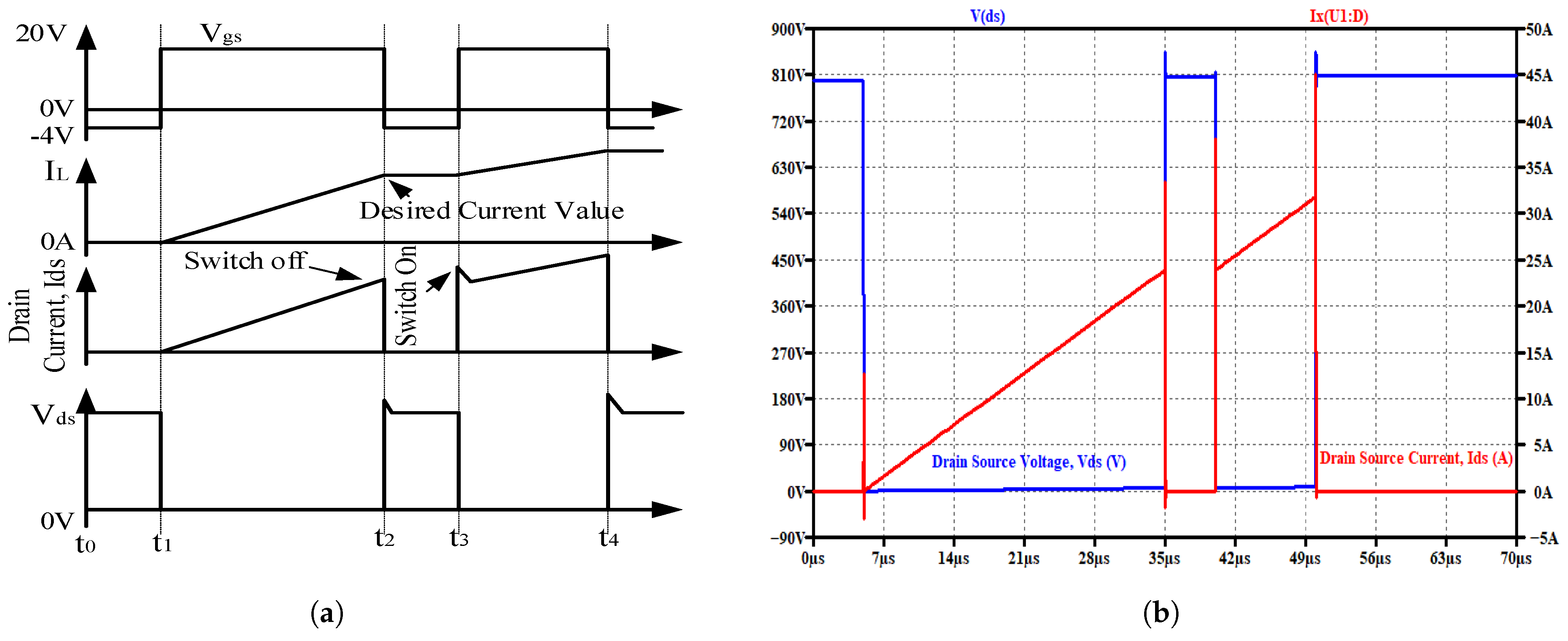 Additionally, during the analysis, a few assumptions are made as follows: and SiC MOSFET is active, with and . When the SiC MOSFET is off, , and . The switch is fully on when .