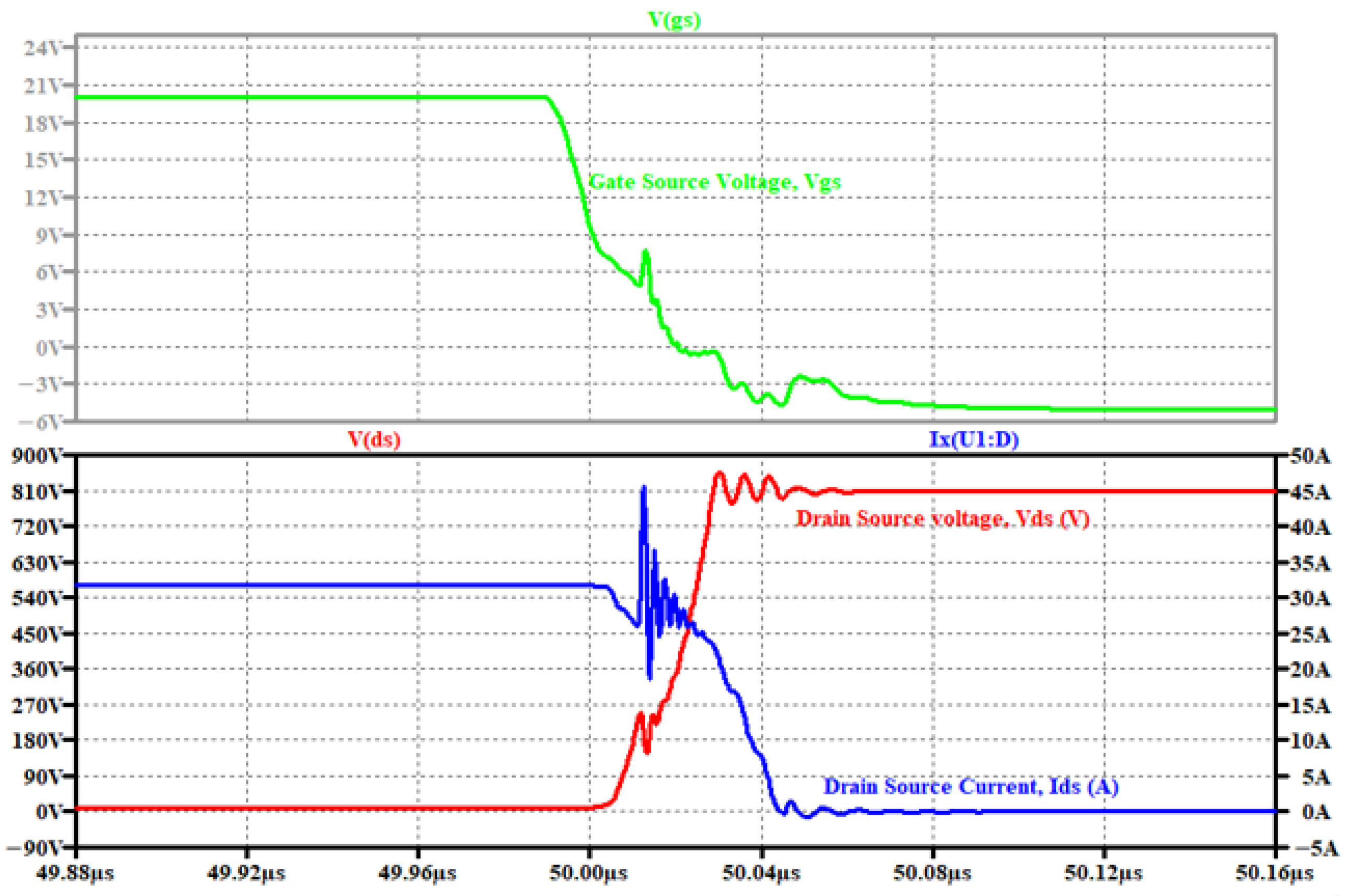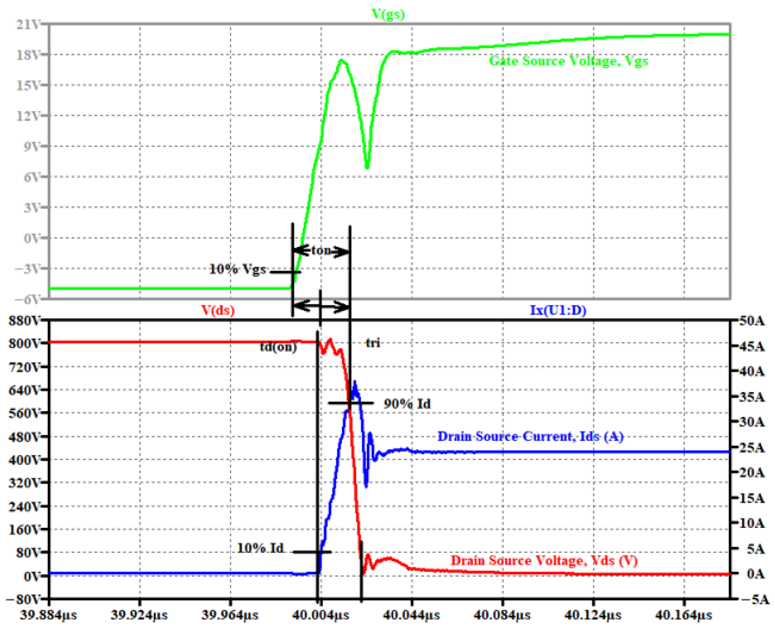 Figure 5 shows the switching waveform of the SiC MOSFET during the turn-on event.