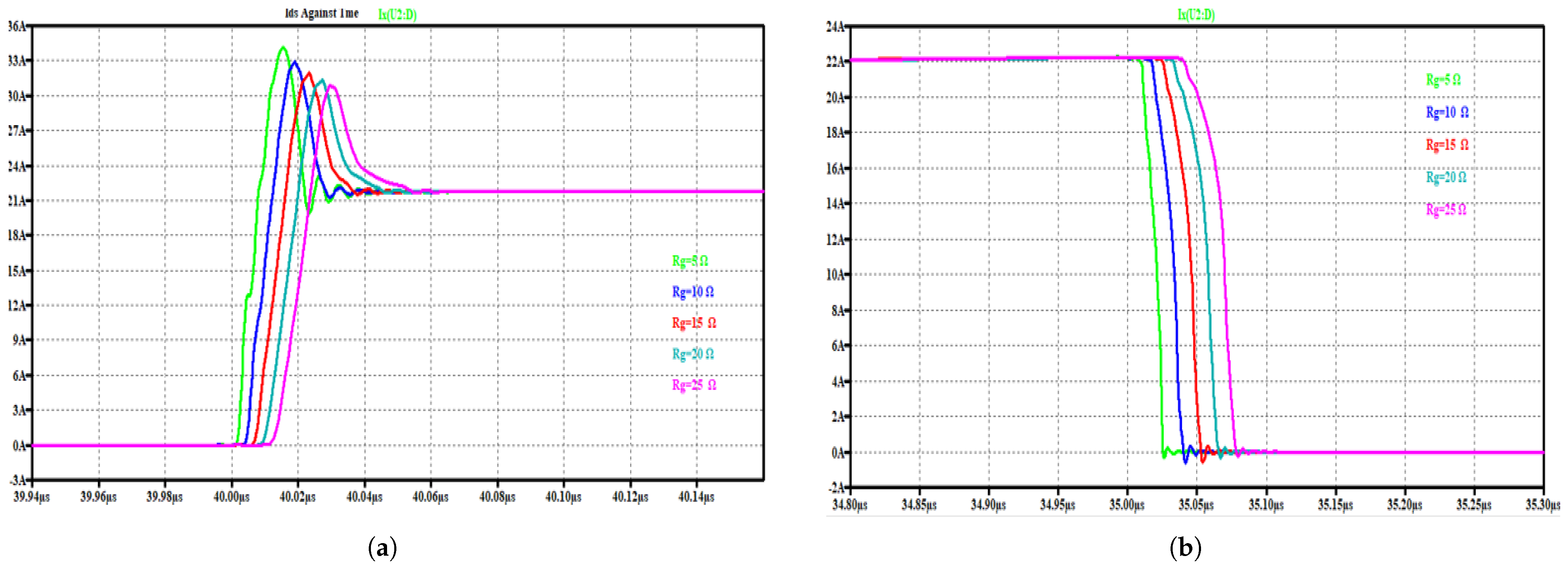 , thus the device current spike increase. Moreover, during the turn-off, as the gate resistance decreases, the fall time of the current decreases. If there was a fast turn-off, there would be a subsequent increase in
