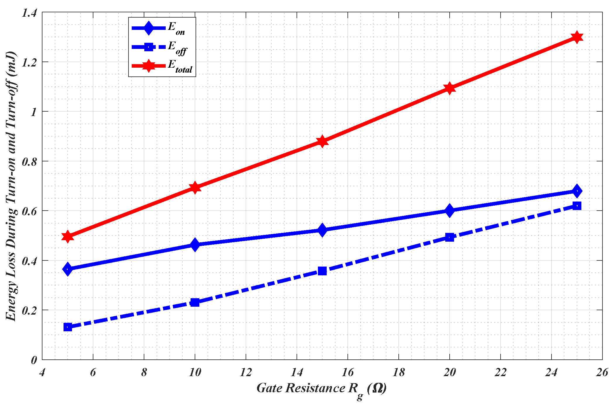 , respectively. The total energy loss curve indicates a linear dependency on the value of the gate resistance. This behavior is consistent with the simulations and measurements reported in [