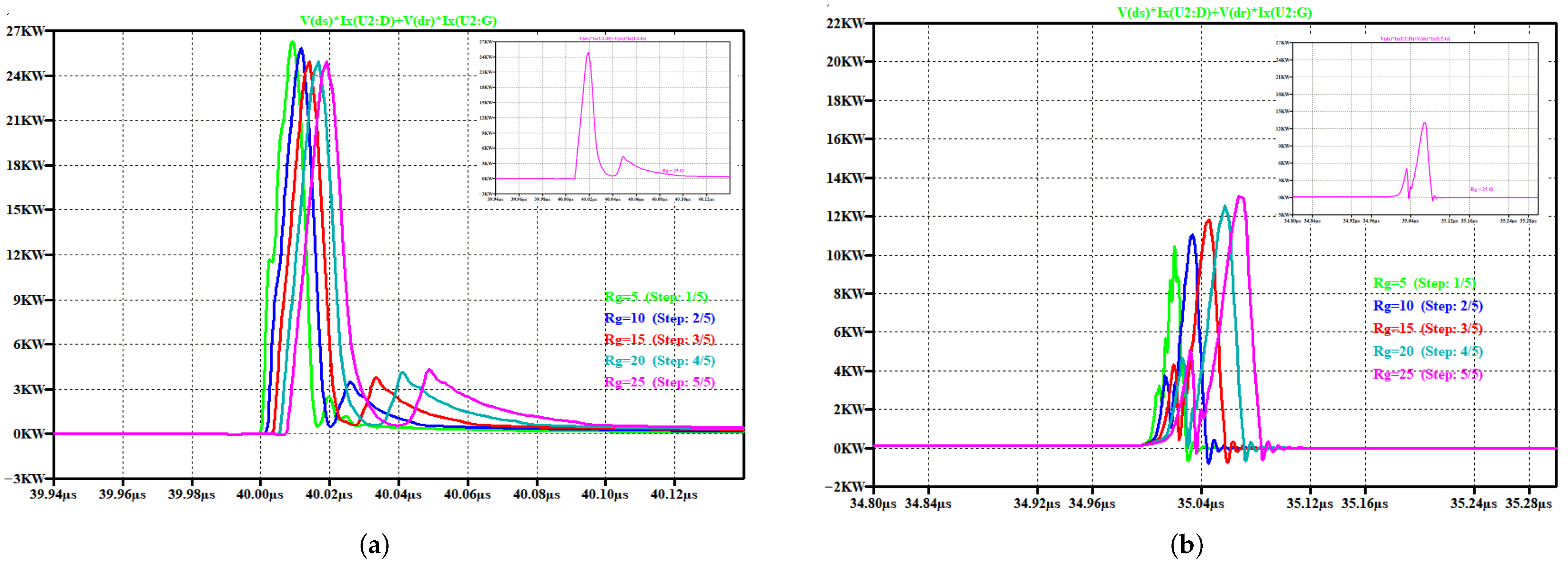 3.3. Turn-On Switching Transients/Transition Turn-On Switching Transients Simulations Results
