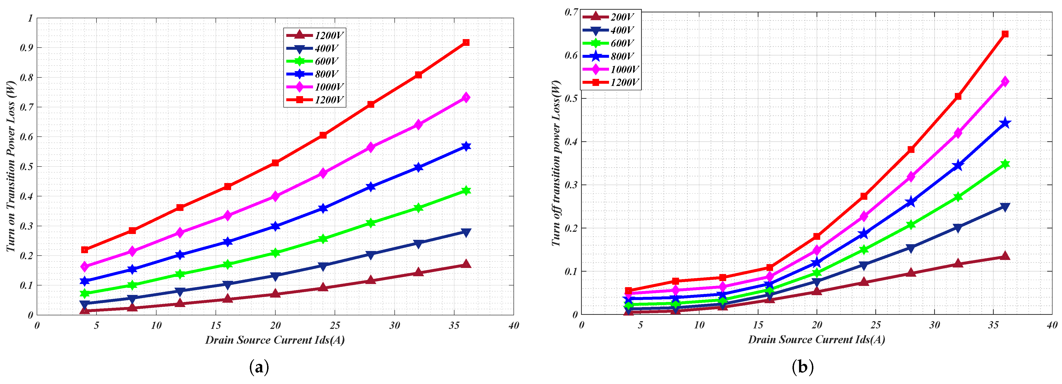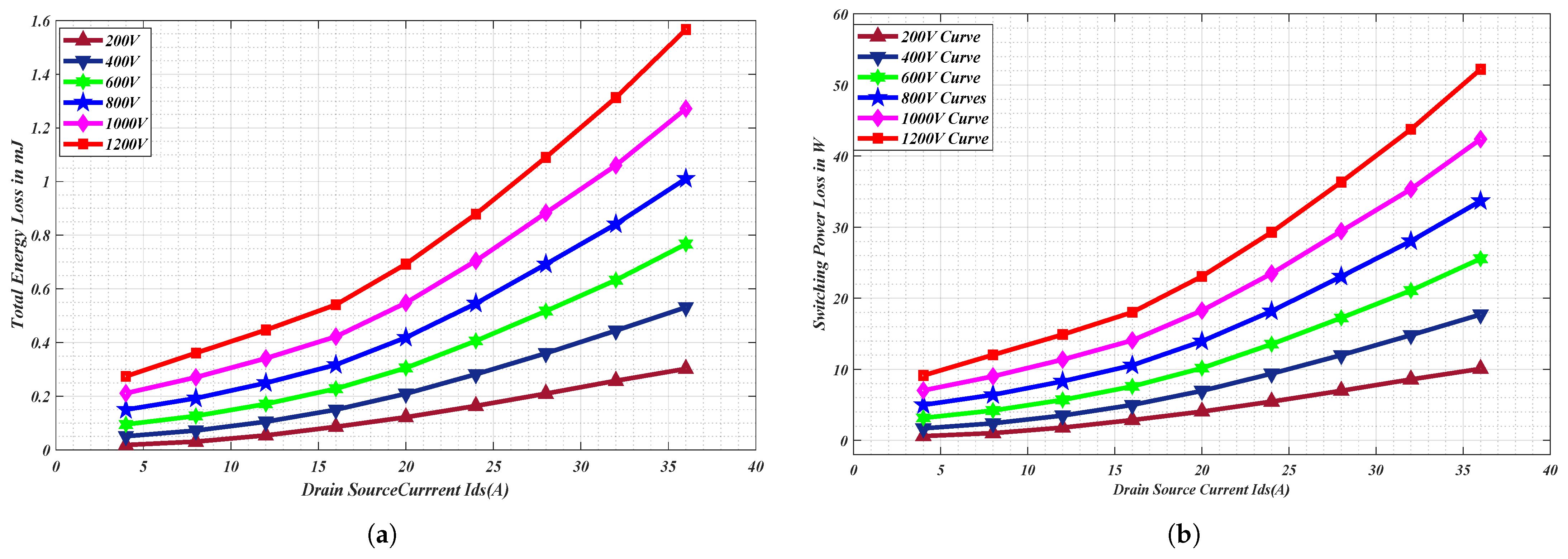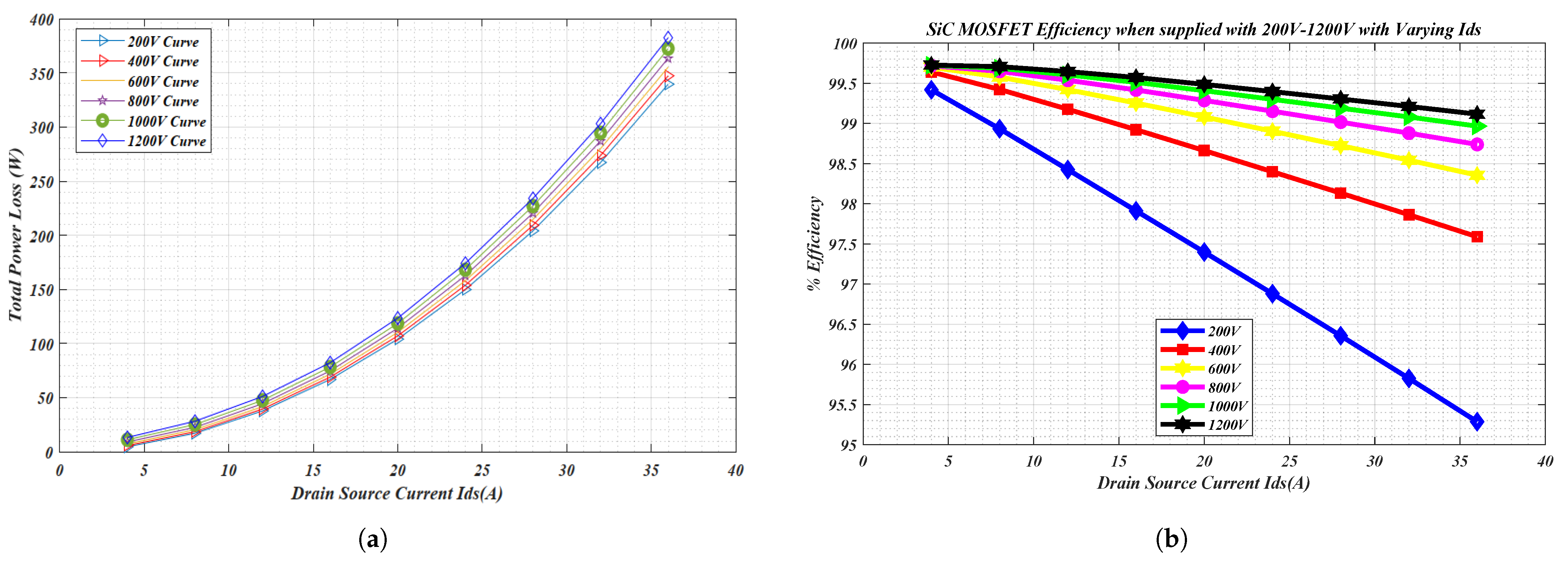Figure 15a shows that the cumulative power loss in a SiC MOSFET is significantly high at high voltages, and lower at low-voltage levels. However, there is a smaller variation in the total loss due to voltage variations at a specific drain-source current. As the current increases, the losses increase to higher values.