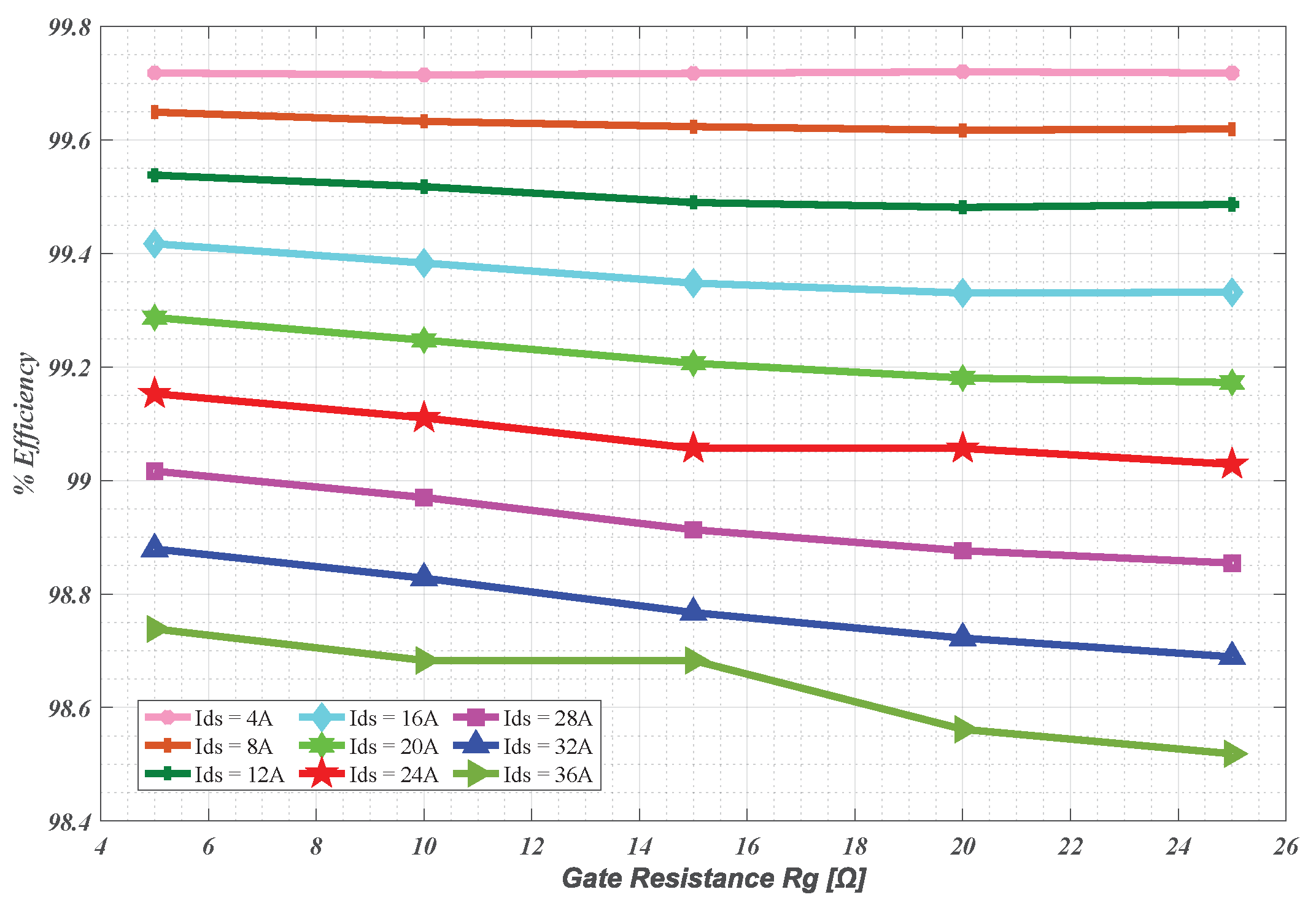 It should be noted that, at the same power output, the efficiency is significantly higher at high voltage as compared to operation at lower voltages. This is because at higher voltages, the conduction loss remains significantly the same as the loss at lower voltages. SiC MOSFET also exhibits properties of lower at higher voltages. Whilst switching loss increases with switching voltages, they do so at a lower rate in comparison to the conduction loss. Since high-voltage switches are well optimized for faster switching and high voltages, they have lower transitional losses at high voltages. However, extremely high voltage can result in the turn-on and turn-off losses being higher as a result of high energy dissipation during the transition.