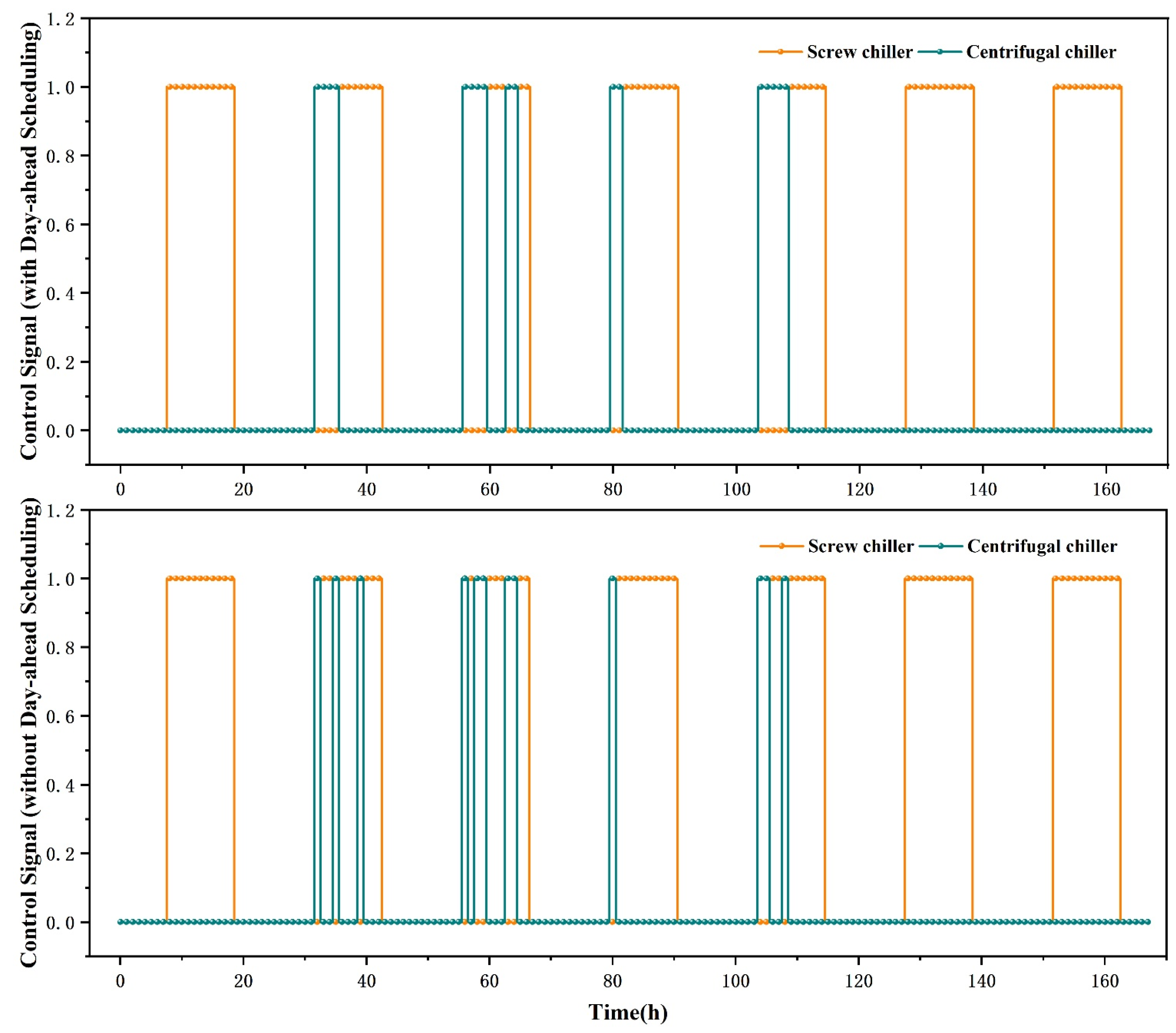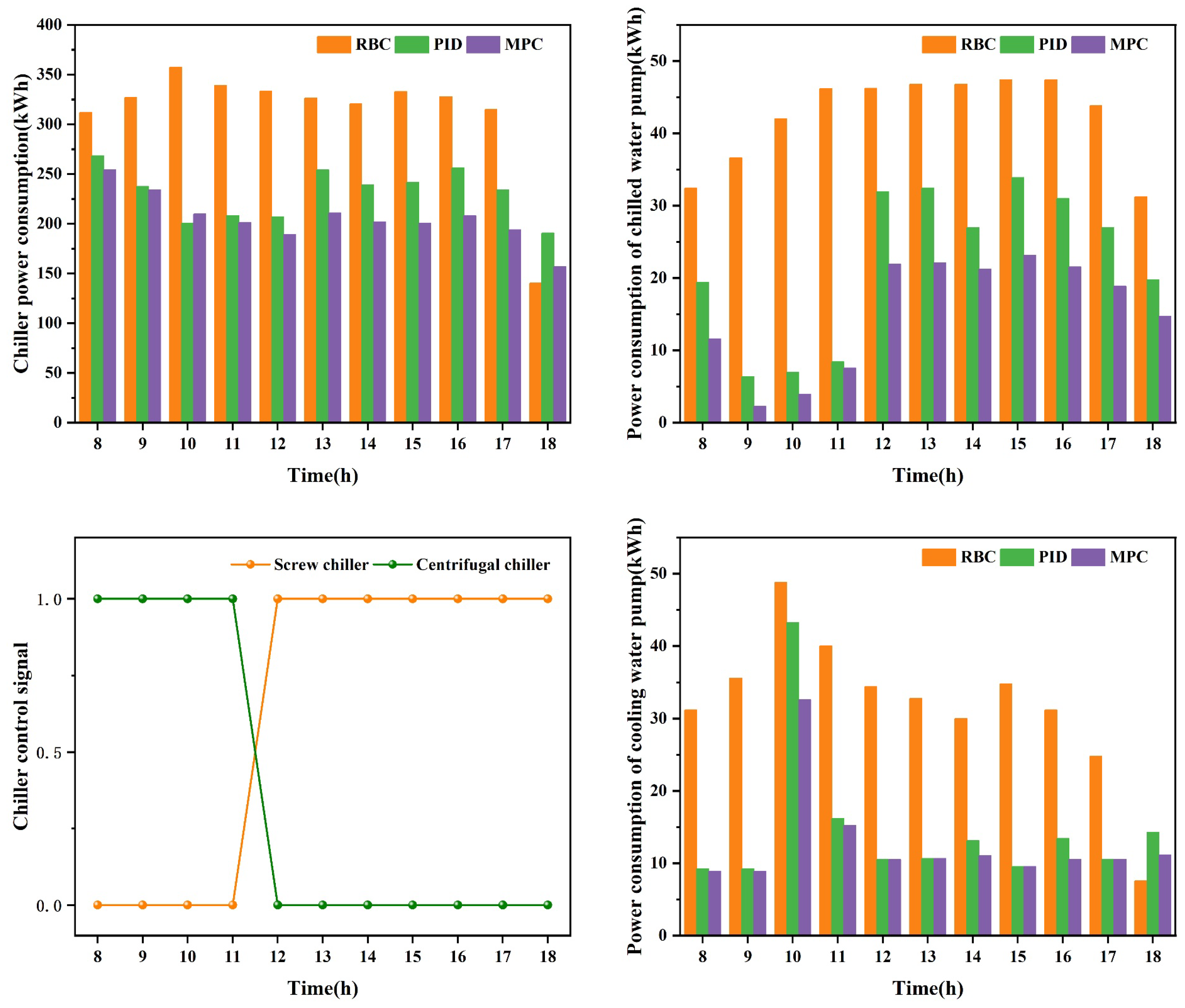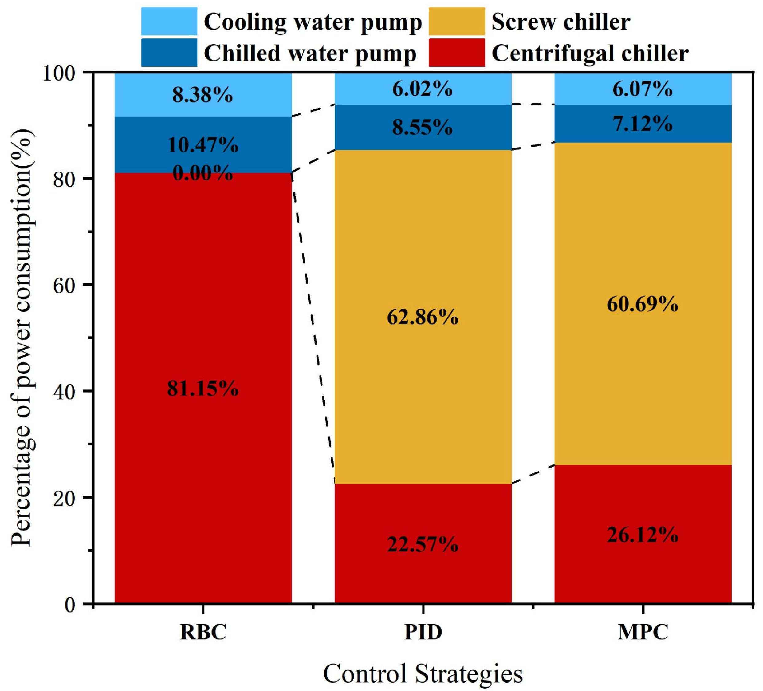 - The day-ahead MPC strategy achieves rational coordinated operation and optimal load allocation among equipment. The system switches equipment based on load variations, with an electricity consumption of 60.69% for screw chillers and 26.12% for centrifugal chillers. Compared to RBC’s single dominant mode with 81.15% centrifugal chiller usage, the equipment configuration is more balanced and efficient.