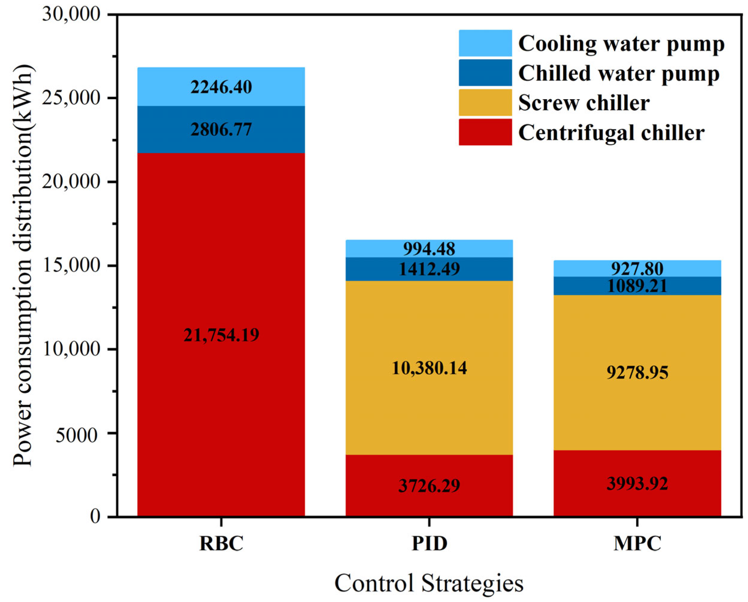 - The day-ahead MPC strategy demonstrates excellent electricity-saving performance. Weekly operation achieves 41.07% electricity savings versus traditional RBC and 9.23% versus PID control. Daily chiller electricity consumption shows 34.11% savings compared to RBC and 10.89% compared to PID control. Over a month of operation, it achieves energy savings of 8.25% compared to PID control, thereby validating the strategy’s electricity-saving potential.