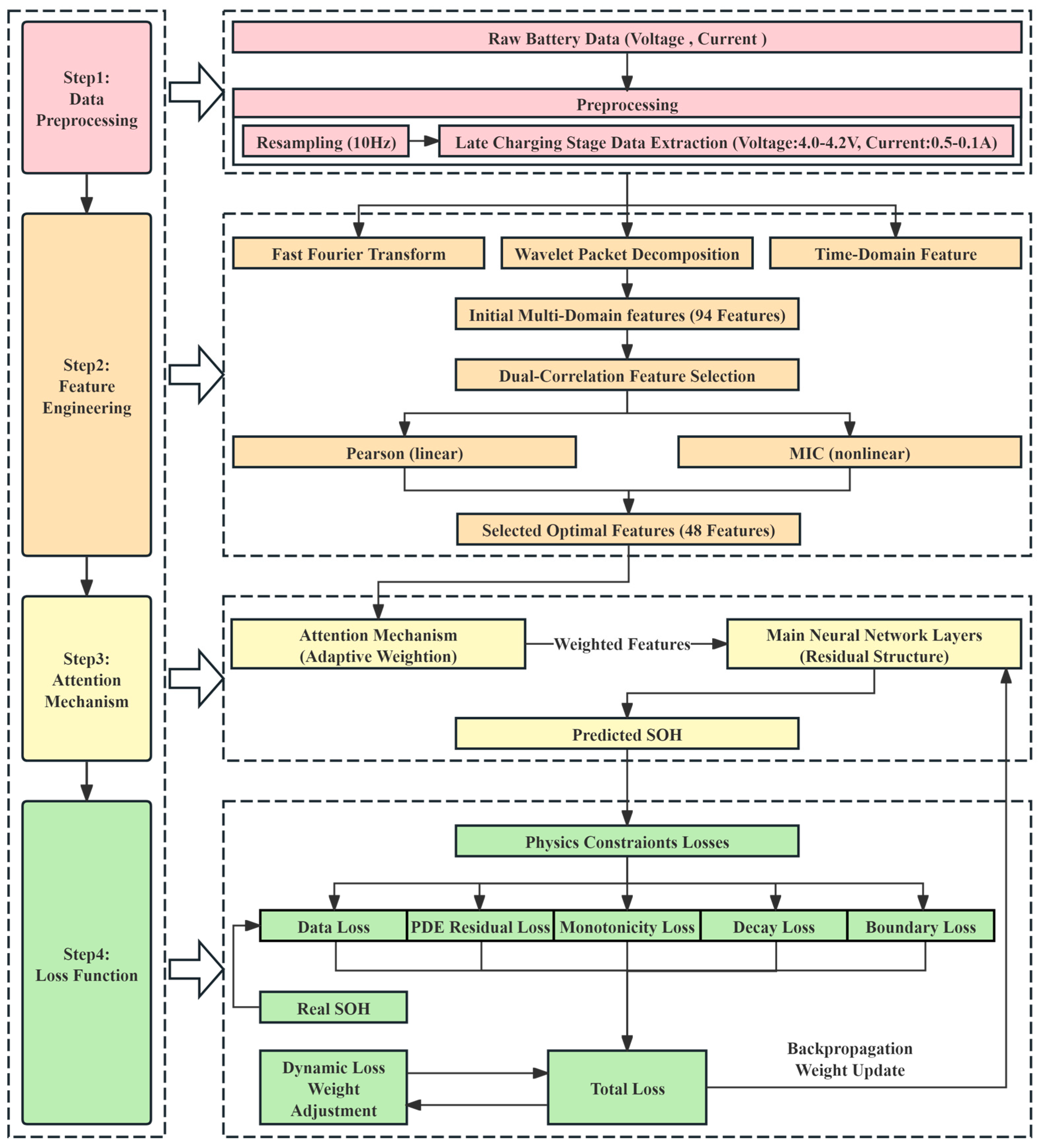 The proposed SOH estimation framework follows a four-stage process: data preprocessing, multi-domain feature extraction, attention mechanism, and improved PINN modeling. The specific steps are shown in
