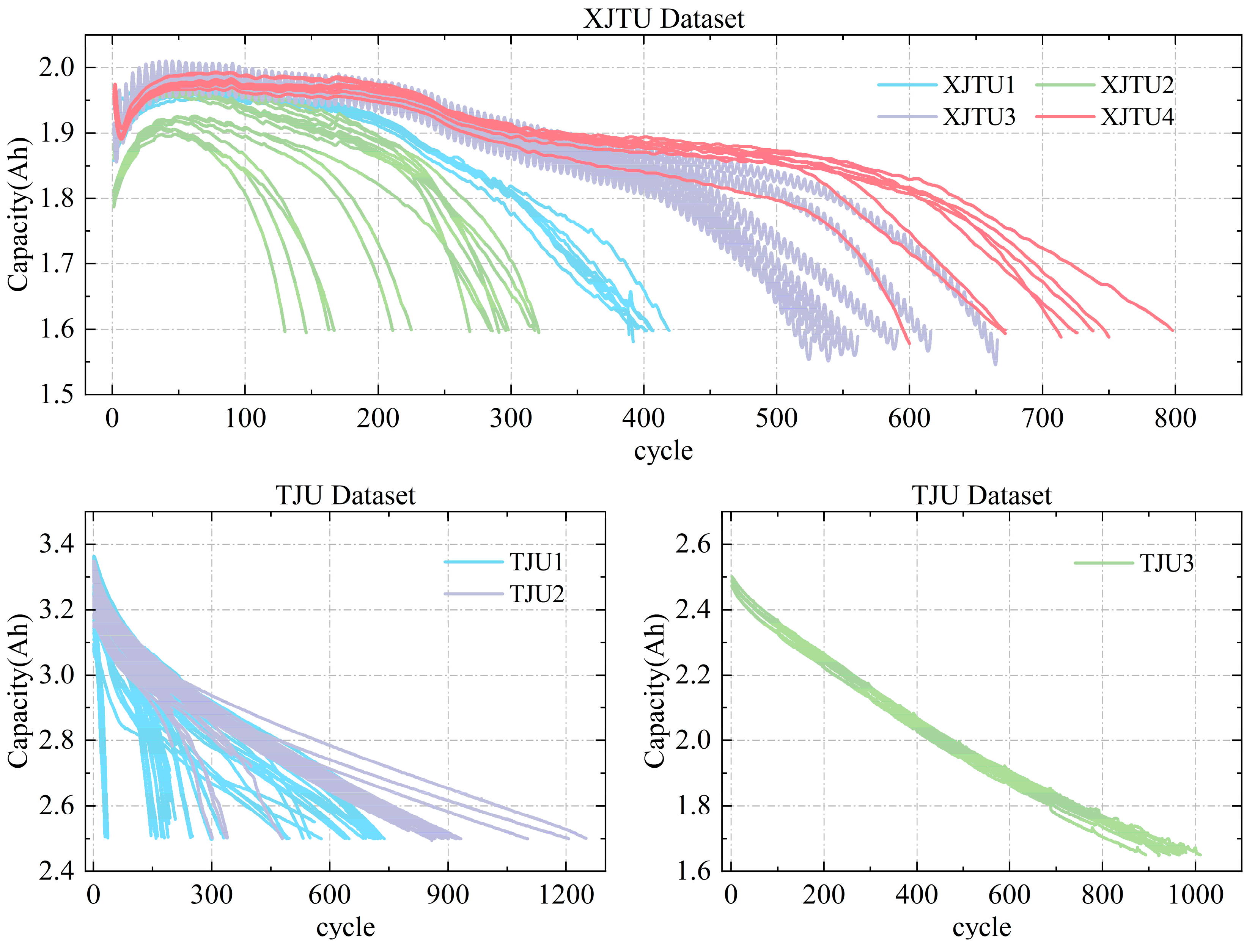 Figure 2 illustrates the capacity degradation trajectories for all batteries across four batches in the XJTU dataset and three batches in the TJU dataset.