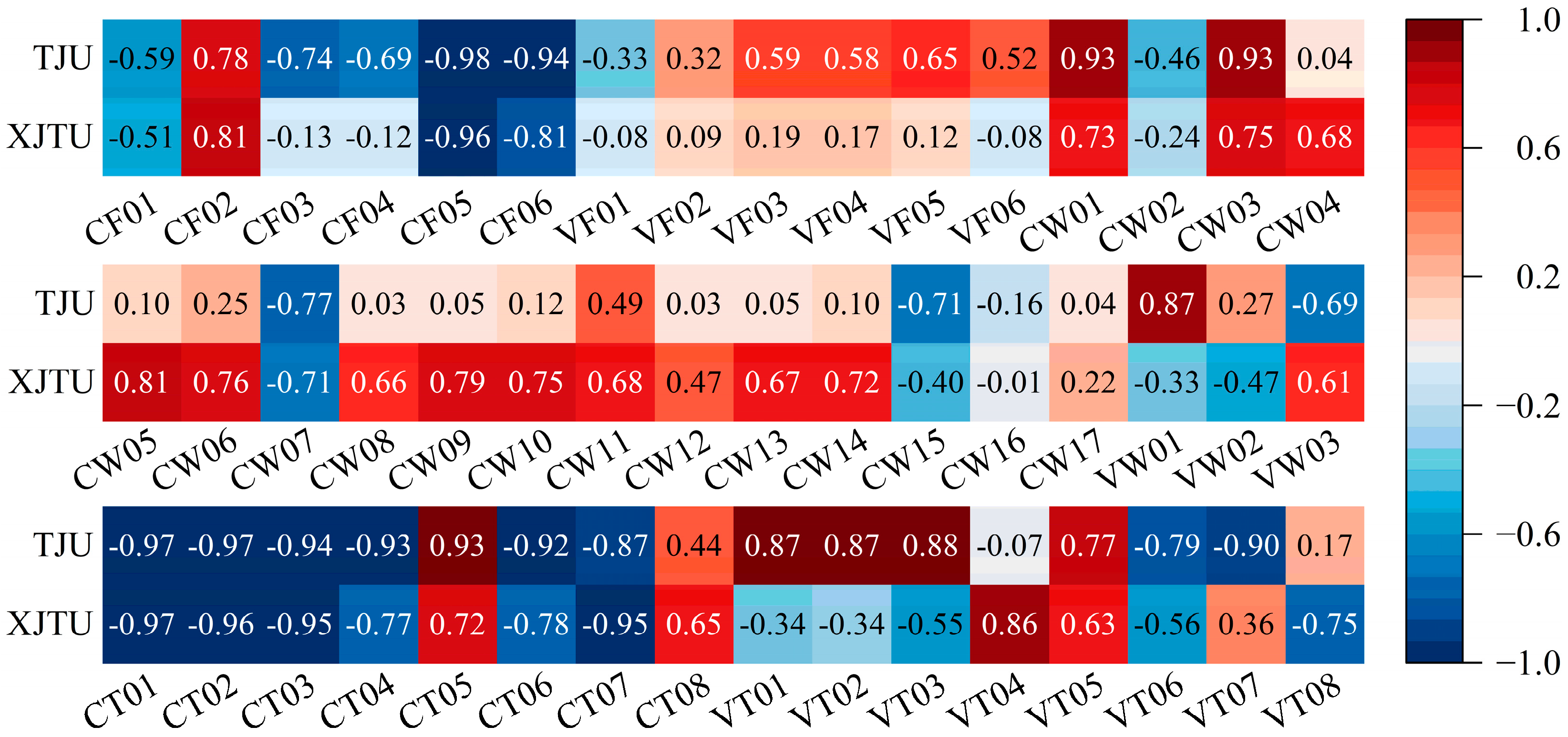 During the feature selection process for Batch 2 of the TJU dataset, it was observed that the correlation between the voltage features extracted using the FFT and the battery’s SOH exhibited an obvious opposite trend with changes in charging–discharging temperature. As illustrated in