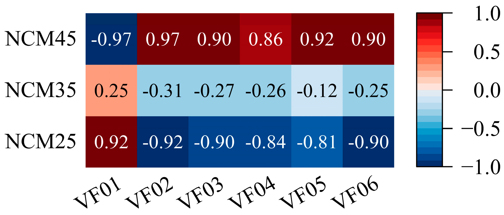 Figure 5, for NCM batteries, the VF01 feature shows a strong negative correlation with SOH at 45 °C, but a strong positive correlation at 25 °C. Similarly, features VF02–VF06 display strong positive correlations with SOH at 45 °C, which reverse to strong negative correlations at 25 °C. Although this opposite trend is also observed at 35 °C, the correlation strength between each feature and SOH at this temperature is not statistically significant. Moreover, this temperature-dependent opposite trend is observed only in NCM batteries; NCA batteries do not exhibit such behavior.