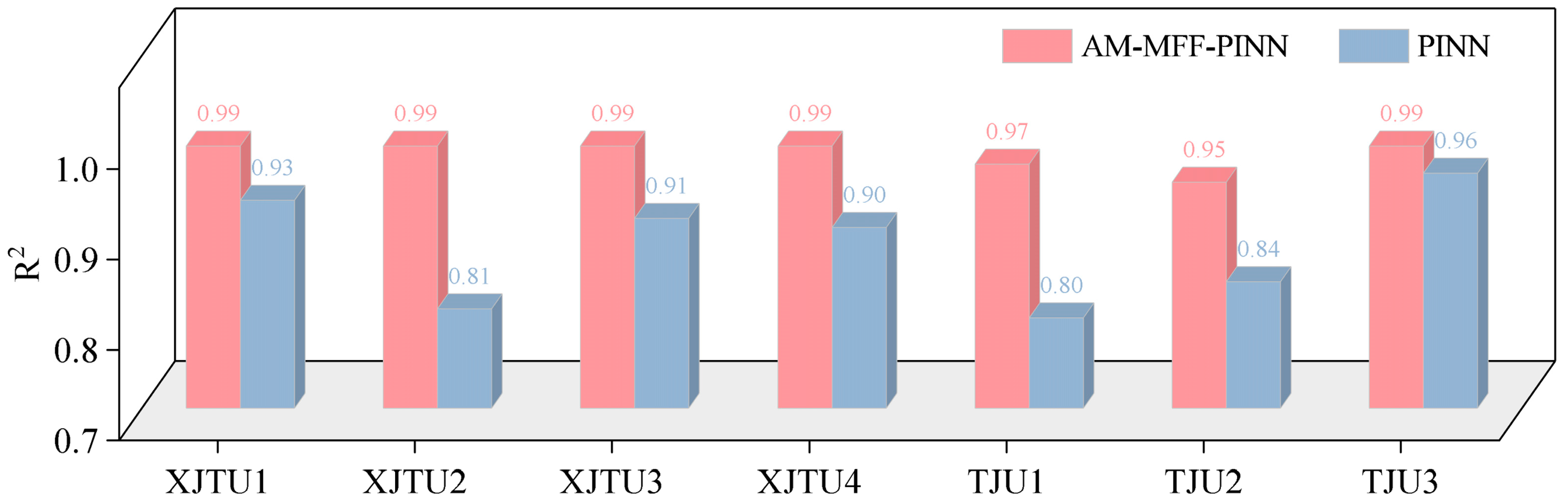 The experimental results from the XJTU and TJU datasets demonstrate that the AM-MFF-PINN model achieves high estimation accuracy, with MAE values of 0.001–0.002 on the XJTU dataset and 0.003–0.007 on the TJU dataset, and values consistently above 0.96. These results verify that the model maintains stable performance across different battery chemistries, temperature conditions, and charging protocols. Compared with a conventional PINN and a CNN model, the proposed approach exhibits clear advantages in accuracy, error robustness, and generalization capability.