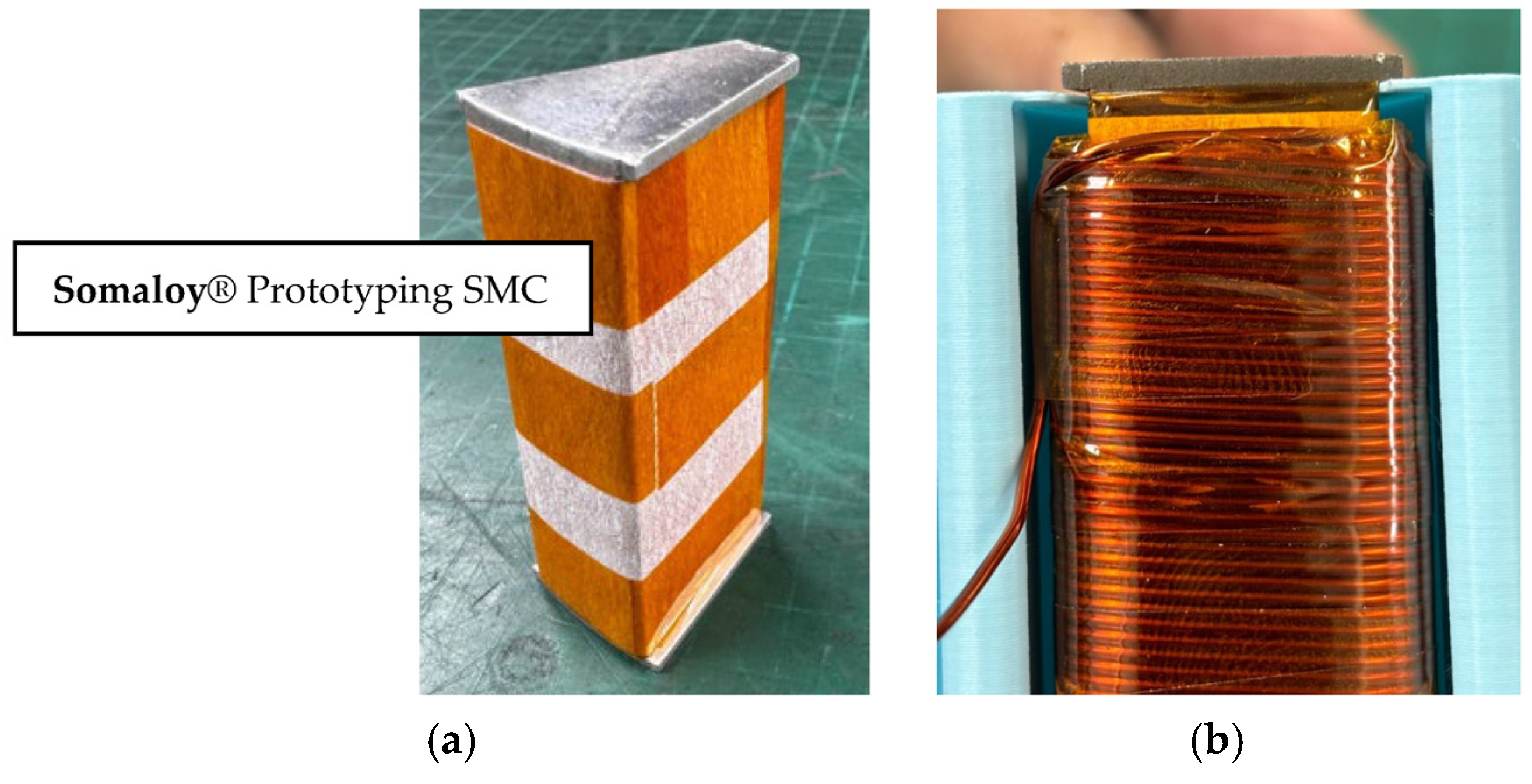 - Asari, A.R.; Guo, Y.; Zhu, J. Performances of SOMALOY 700 (5P) and SOMALOY 500 materials under 1-D alternating magnetic flux density. In Proceedings of the 2019 International UNIMAS STEM 12th Engineering Conference (EnCon), Kuching, Malaysia, 28–29 August 2019; IEEE: Piscataway, NJ, USA, 2019; pp. 52–58. [Google Scholar]
