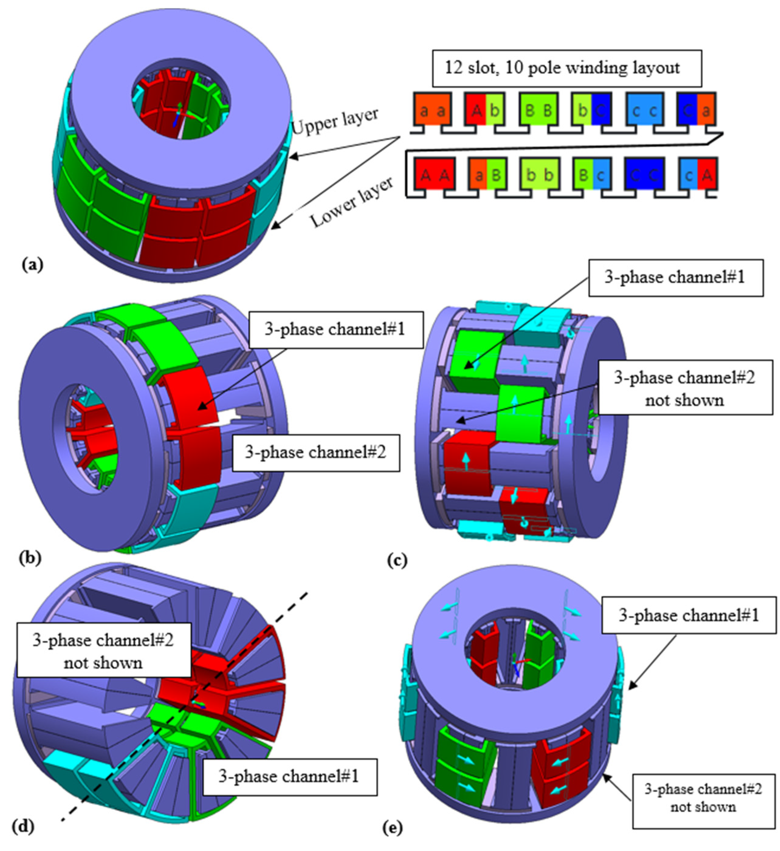 - Barcaro, M.; Bianchi, N.; Magnussen, F. Analysis and Tests of a Dual Three-Phase 12-Slot 10-Pole Permanent-Magnet Motor. IEEE Trans. Ind. Appl. 2010, 46, 2355–2362. [Google Scholar] [CrossRef]